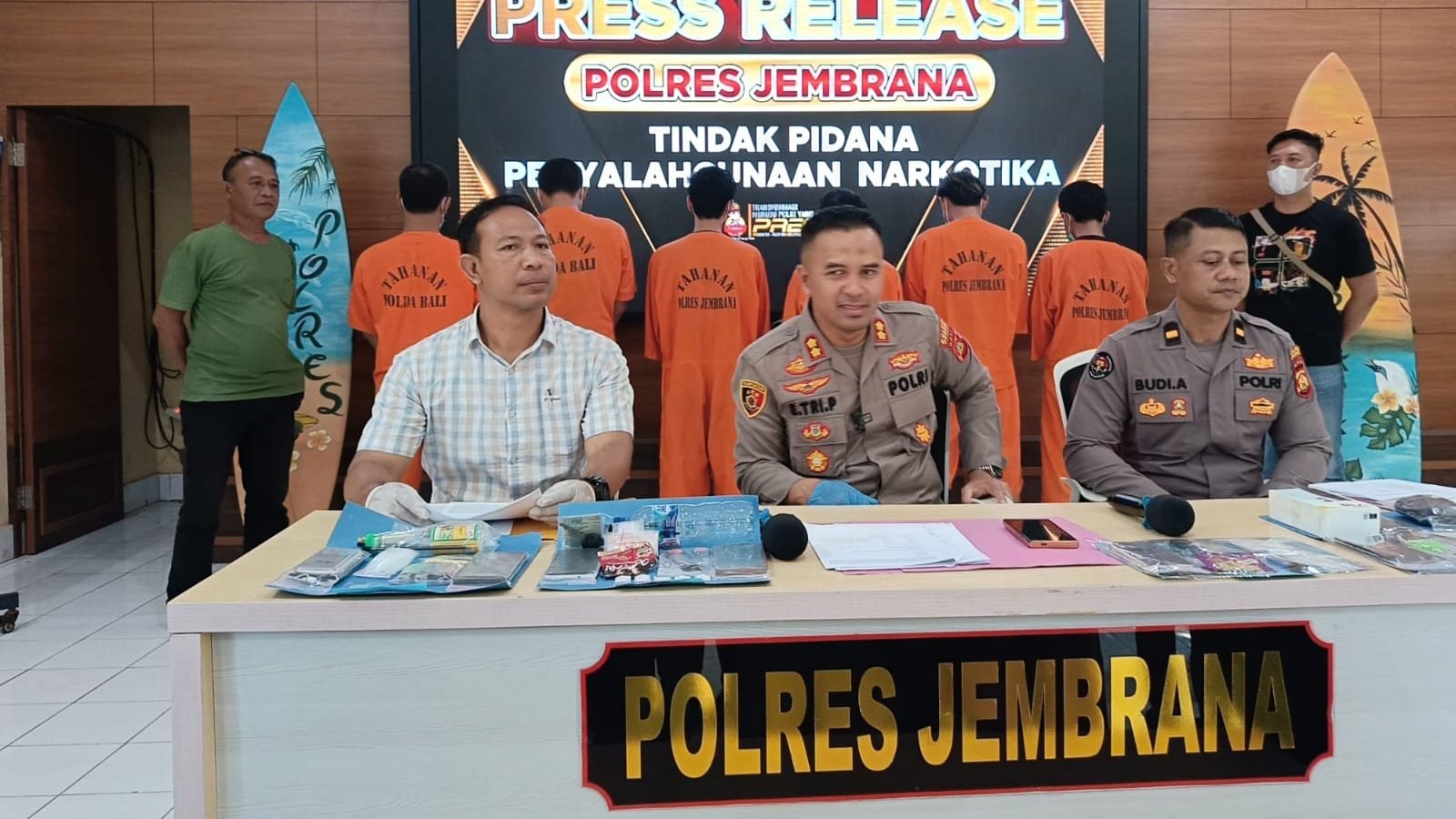 Kapolres Jembrana, AKBP Endang Tri Purwanto, didampingi Kasat Narkoba, Iptu I Gede Alit Darmana dan Kasi Humas, Ipda I Putu Budi Arnaya saat Jumpa Pers di Aula Mapolres Jembrana. Rabu (9/4/2025).