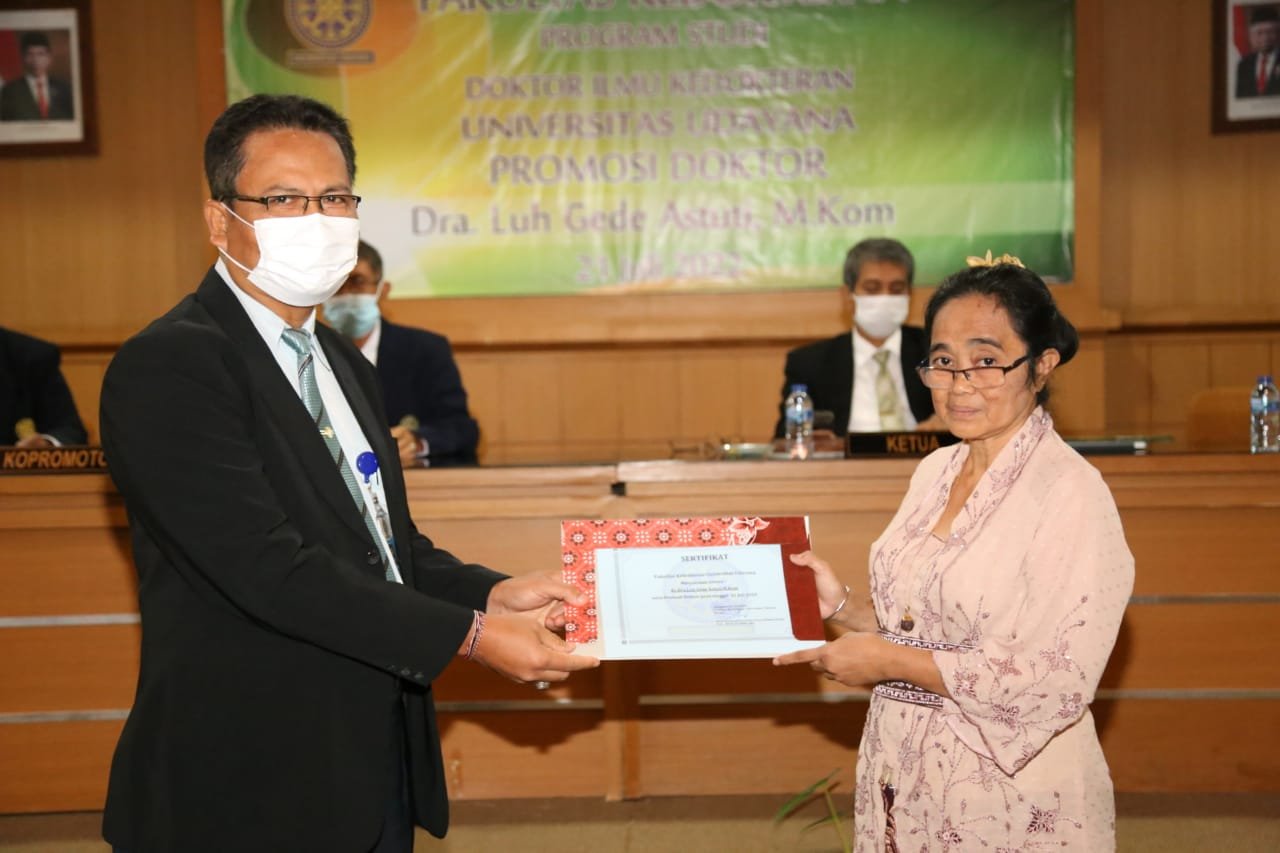 Caption: Ujian Promosi Doktor dengan kandidat promovenda Dra. Luh Gede Astuti, M.Kom terkait Ergo-Learning di ruang sidang Lt III, Gedung Pascasarjana, Denpasar (21/7/2022). Foto: Unud