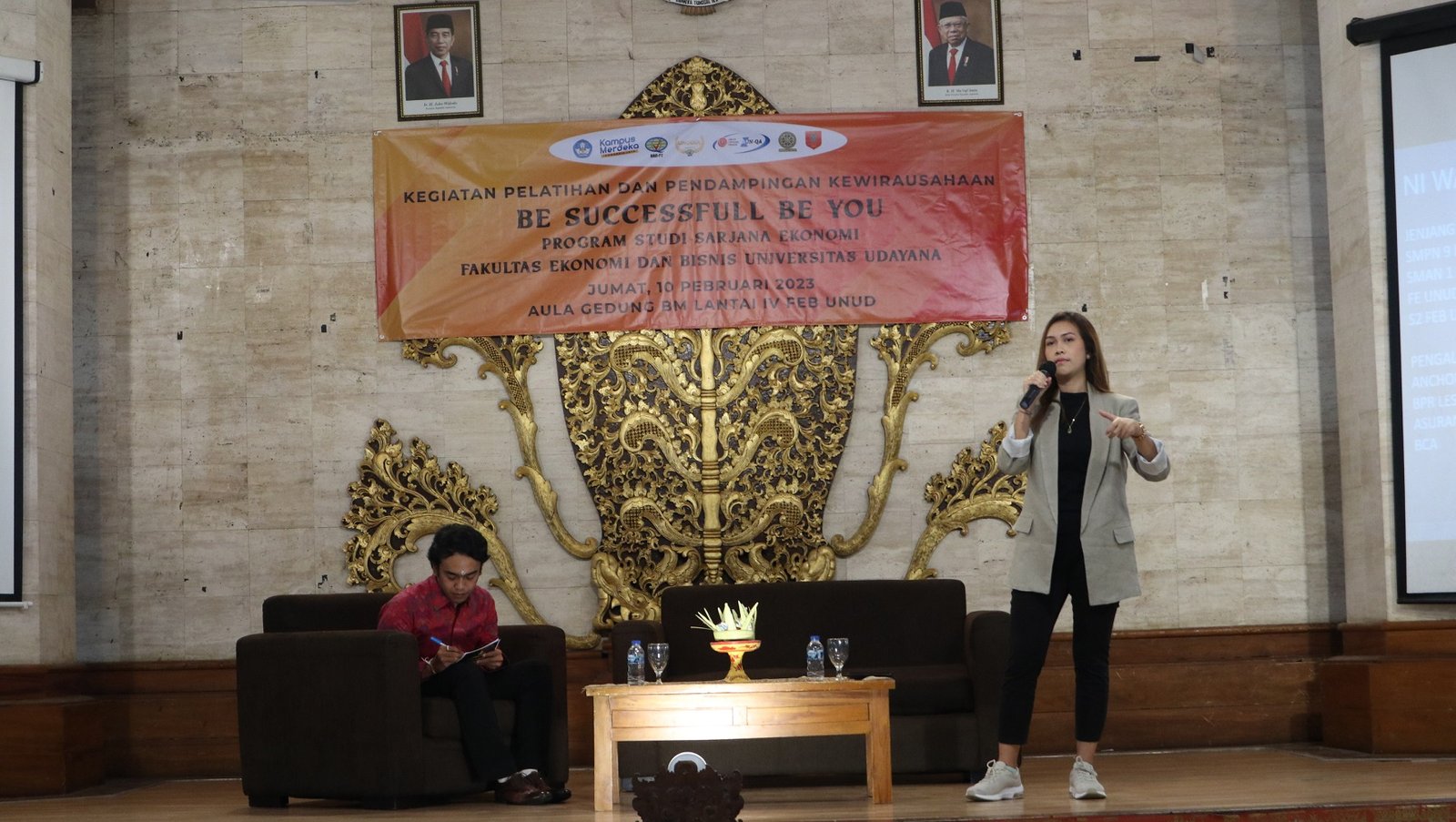 Kegiatan Pelatihan dan Pendampingan Kewirausahaan menghadirkan pembicara Ni Wayan Nurani Wijayanti, S.E., M.M dari CV. Dayuhsini (Toko Dapurku) di Aula Gedung BM lantai IV FEB Unud, Jumat, (10/2/2023). (Foto; FEB Unud)