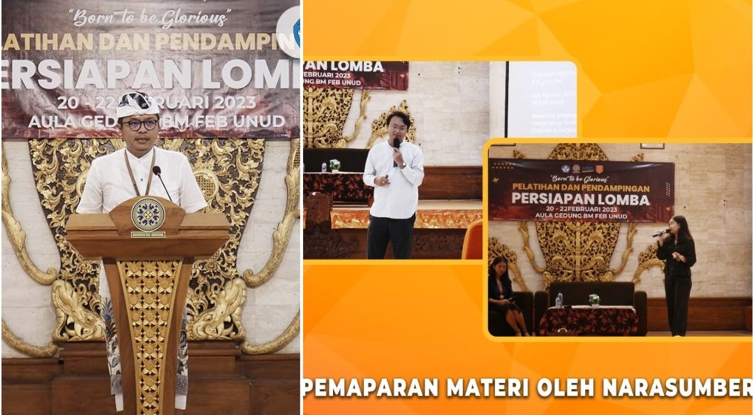 Workshop Pelatihan dan Pendampingan Persiapan Lomba hadirkan 2 narasumber di Aula Gedung BM Fakultas Ekonomi dan Bisnis Universitas Udayana (FEB Unud) pada Senin, (20/2/2023) hingga Rabu, (22/2/2023) dari pukul 08.00 – 13.00 Wita. (Kolase: BB/FEB Unud)