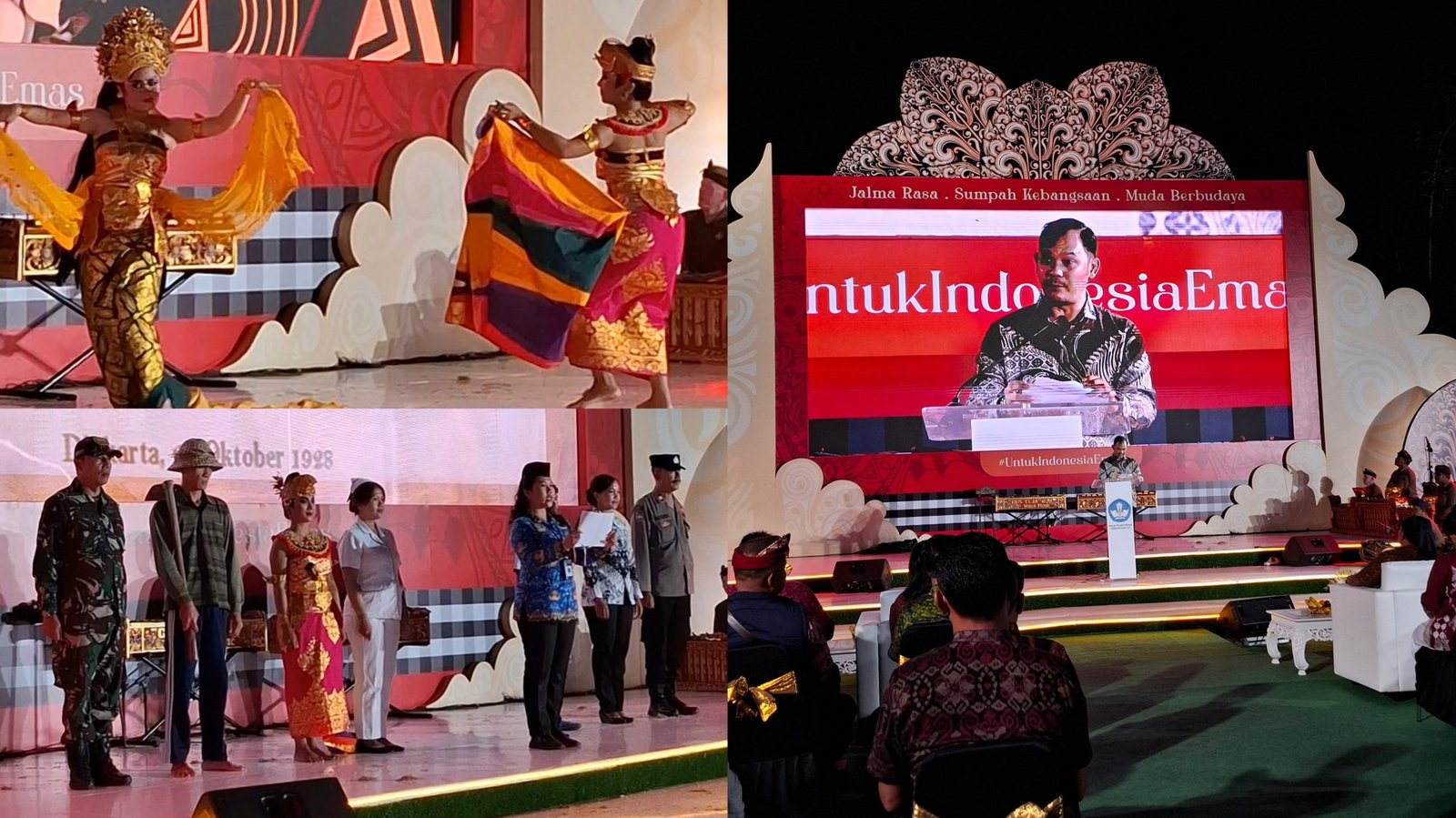 Kolase foto: Festival Muda Berbudaya menampilkan berbagai atraksi budaya seperti Tari Oleg Tamulilingan, Wayang Subak, Bondres Rare Kual, Orkestrasi Gus Teja, Gong Kebyar, dan Tarian Api Sumpah Pemuda di kawasan Monumen UNESCO, Subak Jatiluwih, Kecamatan Penebel, Tabanan, Senin (28/10/2024) malam. (barometerbali/213)
