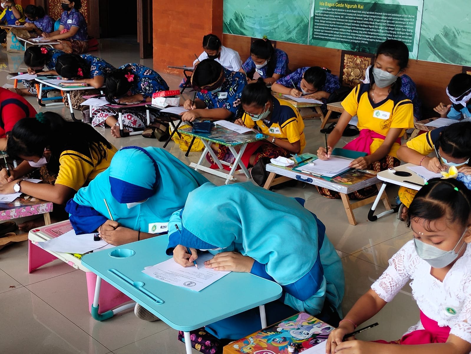 Foto: Sebanyak 427 anak SD se-Kota Denpasar 2 di antaranya dari SD non-Hindu mengikuti Festival Nyurat Aksara Bali di Lumintang, Rabu (11/5/2022)