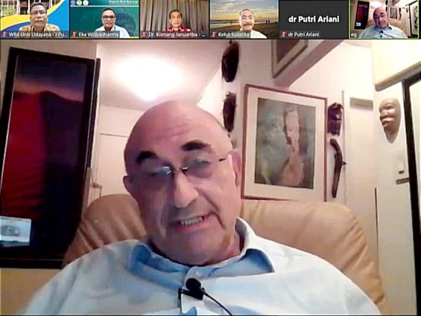 Caption: Kerja sama secara daring antara Fakultas Kedokteran Unud dengan Cornell University dihadiri oleh Prof. Elkhonon Golberg dan Prof. Michael G. Stewart, M.D., M.P.H. dari International Affairs. (Foto/Unud)