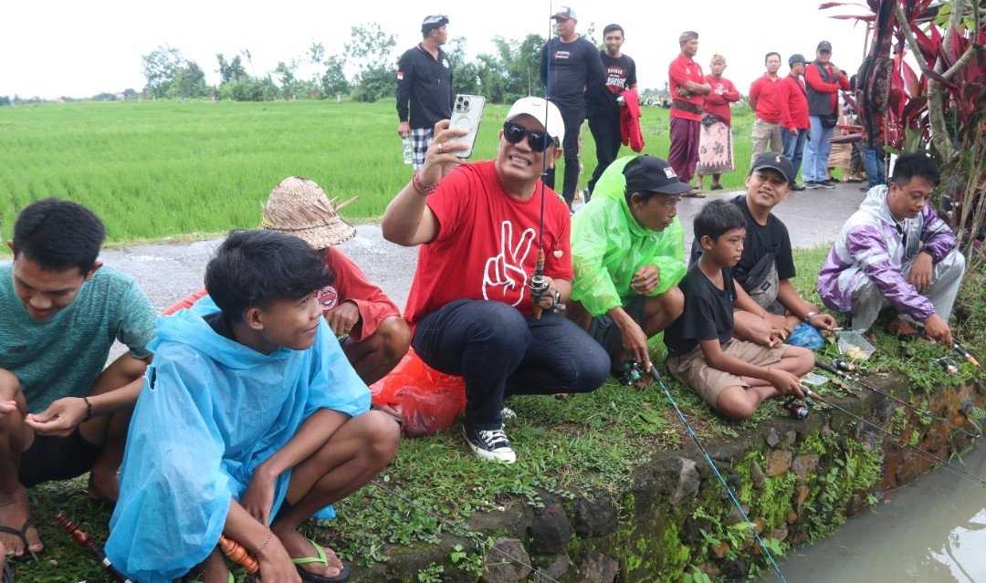 Foto: Bupati Sanjaya swafoto dengan peserta lomba mancing yang digelar ST. Stiti Winangun Desa Belumbang, Kerambitan, Minggu (29/12/2024). (barometerbali/pkptbn/213)