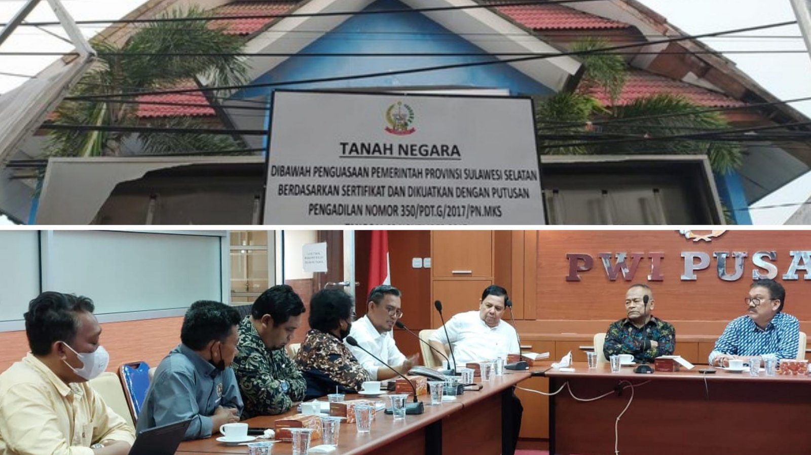 Ket foto: Gedung PWI Sulsel (foto: detik.com) yang dipasangi papan penyegelan oleh Pemprov Sulsel (atas) dan Pengurus PWI Sulsel ketika bertemu Pengurus PWI Pusat (bawah)