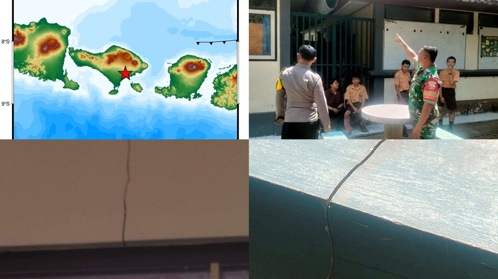 Kolase foto: Kerusakan yang ditimbulkan akibat guncangan gempabumi dengan magnitudo 4.9 yang berpusat di Desa Sidan, Gianyar Sabtu (7/9/2024) pukul 09:51:44 Wita, lokasi 8.52 LS,115.35 BT kedalaman 10 km. (Sumber: barometerbali/bpbd/bmkg)