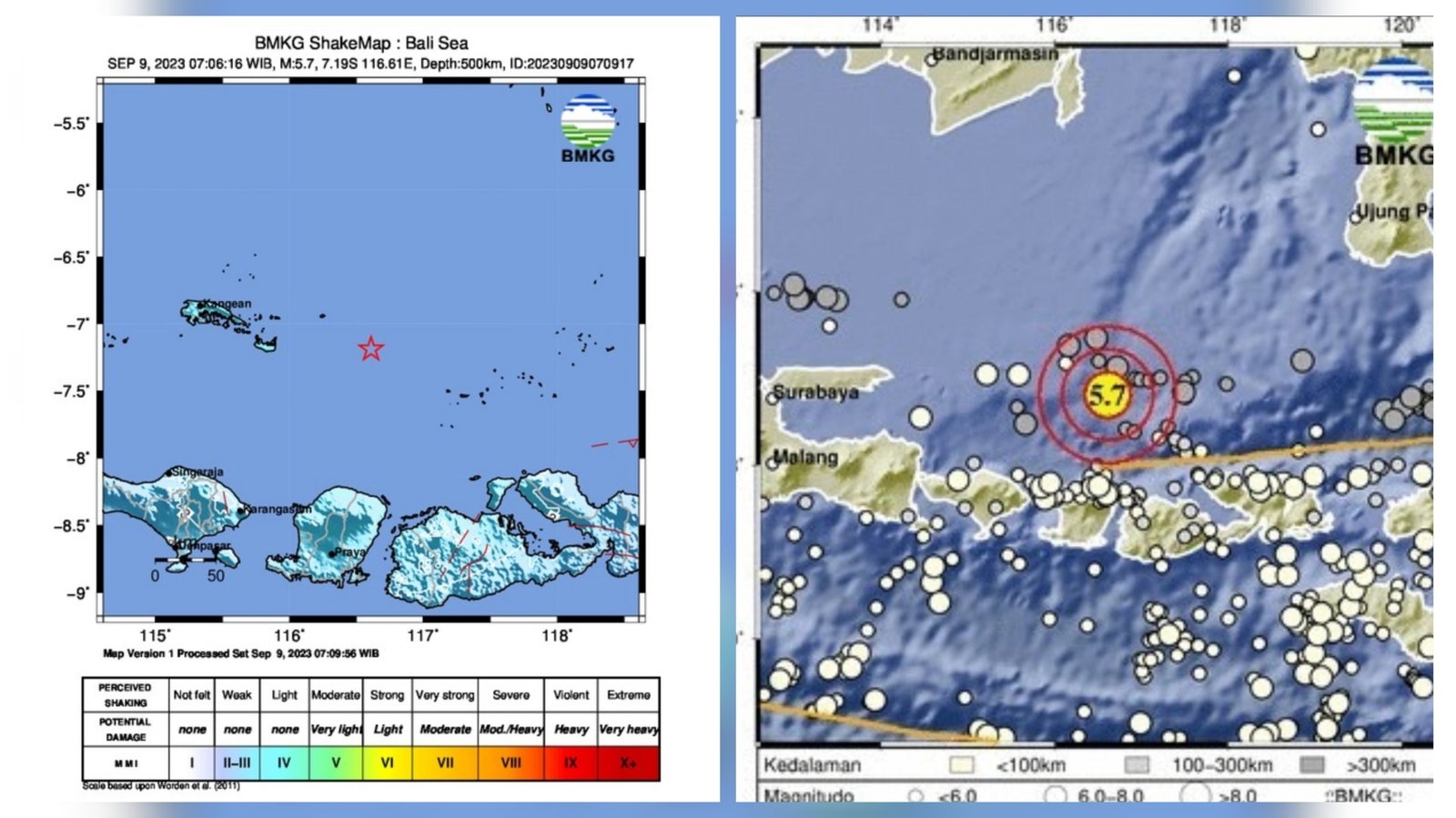 Kolase tabel: Gempabumi tektonik M5,8 Sabtu (9/9/2023) pukul 07.06.16 WIB. Episenter gempabumi terletak pada koordinat 6.96° LS ; 116,52° BT, atau tepatnya berlokasi di laut pada jarak 160 km Timur Laut Lombok Utara, Nusa Tenggara Barat pada kedalaman 511 km. (Sumber: BMKG)
