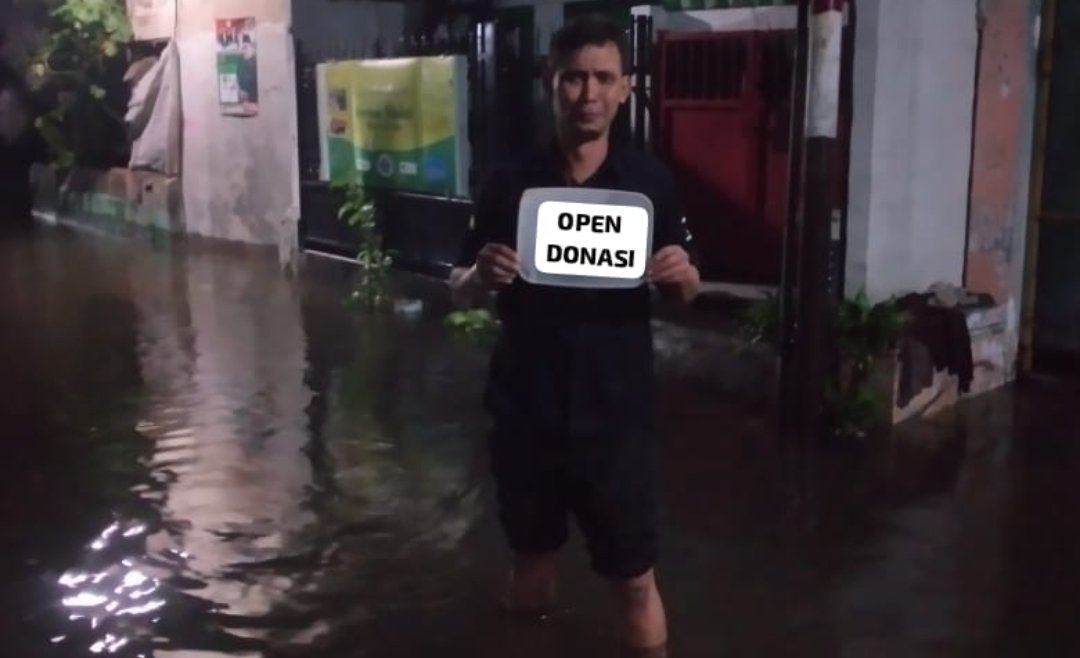 Foto: Seorang warga meminta bantuan donasi saat hujan deras mengguyur Kota Surabaya pada Senin (5/2/2024) malam. (Sumber: BB/Redho)
