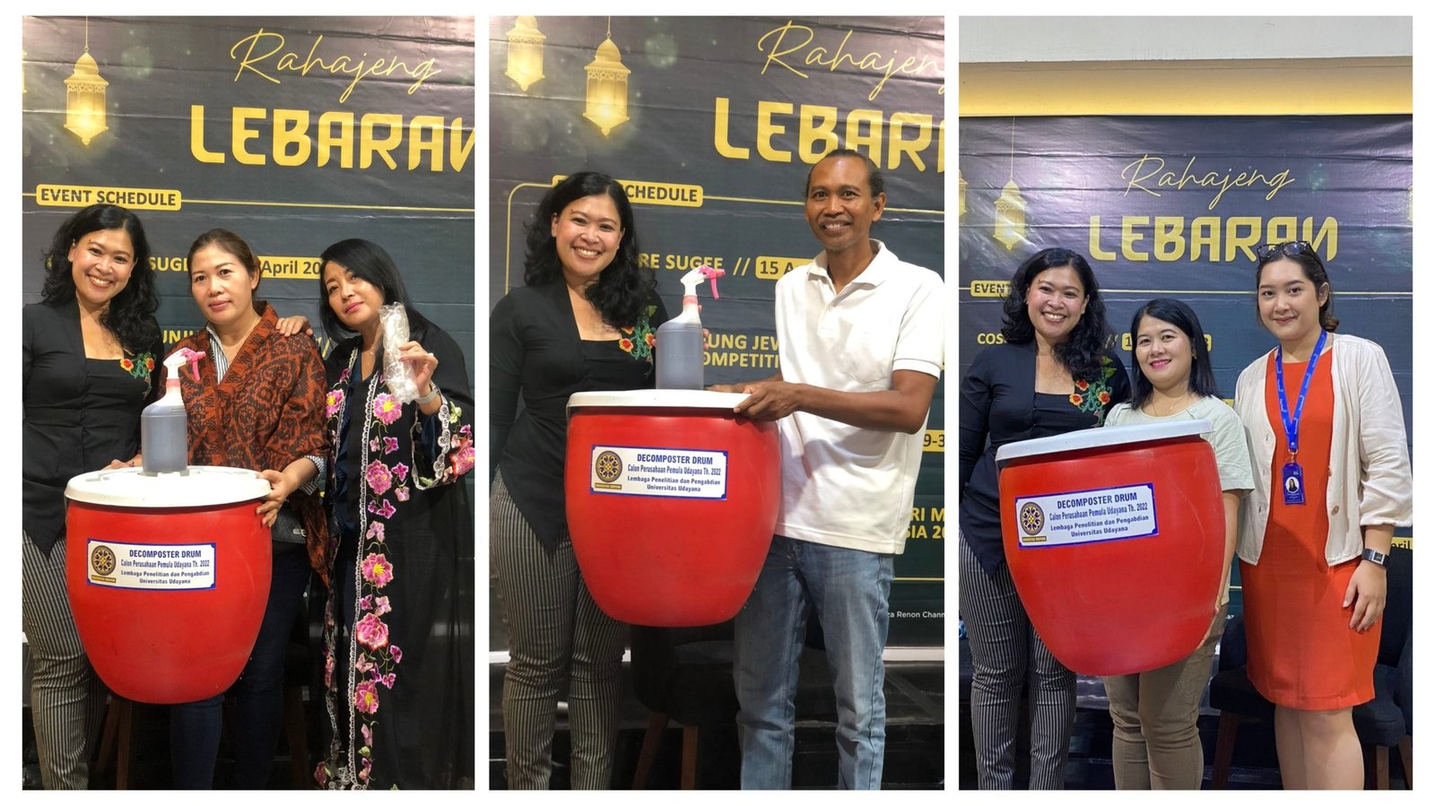 Dosen Fakultas Pertanian Unud Sri Sutari (kebaya hitam) saat menyerahkan tong decomposter kepada para pengunjung dan peserta talkshow serangkaian Hari Kartini di Plaza Renon Mall, Jumat (21/4/2023) lalu. (Kolase: BB/SS)