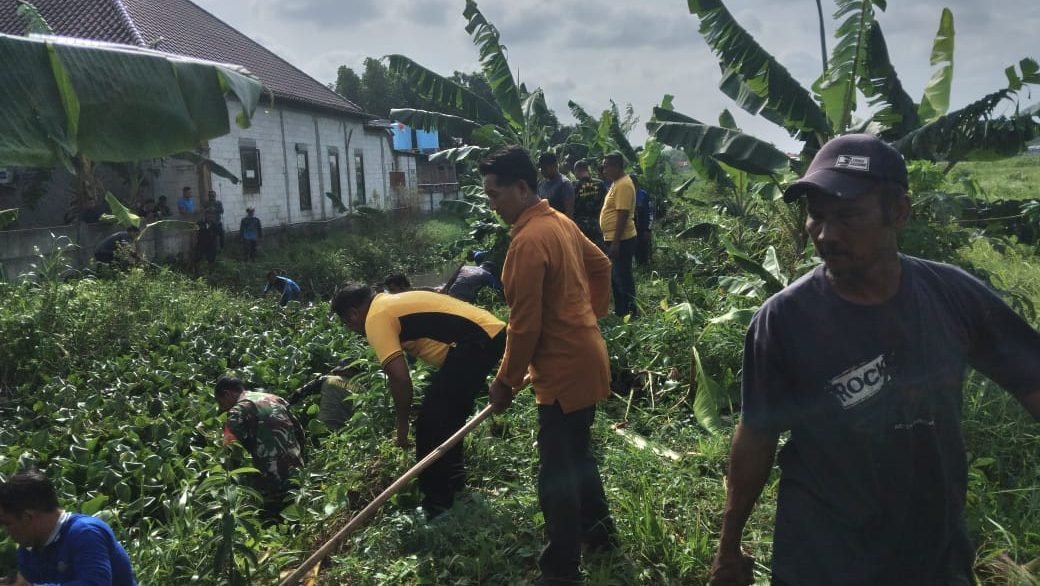 Kapolsek Krian Kompol I Gede Putu Atma Giri bersama anggota Polsek  bergabung dengan personel TNI dari Koramil Krian, serta perangkat Desa Junwangi dan warga melaksanakan kerja bakti gotong royong membersihkan aliran sungai dari enceng gondok dan sampah.