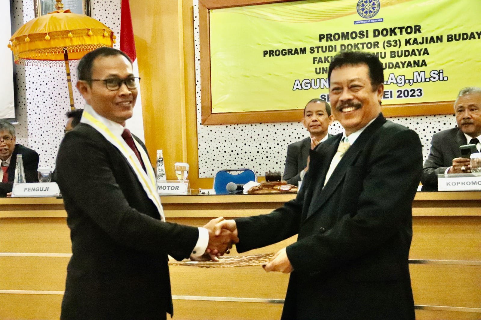 Agung Adi dinyatakan lulus setelah mempertahankan disertasi berjudul “Konstruksi Identitas Kultural Hindu di Kota Palangka Raya” dalam ujian terbuka yang dipimpin Dekan FIB Unud yang diwakili oleh Wakil Dekan I, I Nyoman Aryawibawa, M.A., Ph.D.