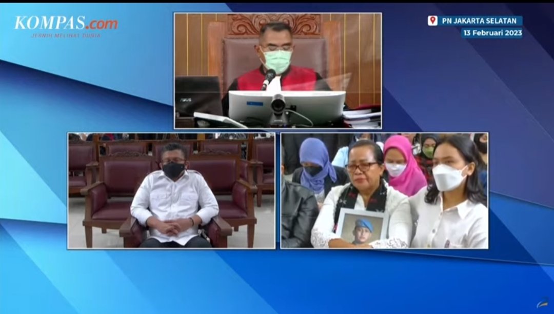 Ketua Majelis Hakim Wahyu Iman Santoso saat membacakan putusan hukuman mati untuk terdakwa Ferdy Sambo disaksikan Ibunda mendiang Brigadir J, Rosti Simanjuntak di PN Jakarta Selatan, Senin (13/2/2023). Sambo terbukti secara sah dan meyakinkan bersalah melakukan pembunuhan berencana terhadap Brigadir J alias Brigadir Yosua. (Tangkapan Layar: Youtube/Kompas.com)