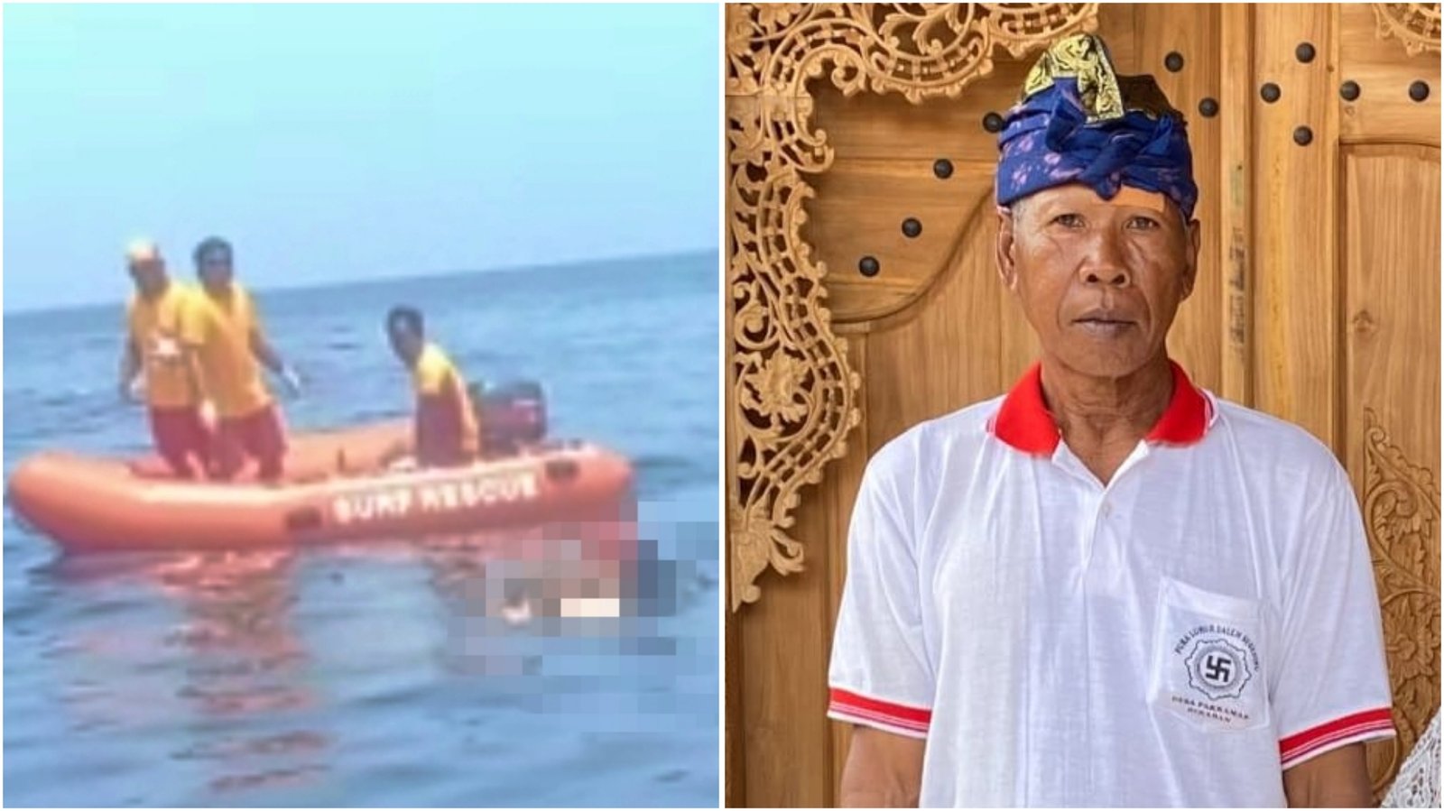 Relawan Balawista Batu Bolong (kiri) menarik jenazah Ketut Suja usia 65 tahun (inzet) dengan perahu karet dari tengah laut dievakuasi menuju Pantai Batu Bolong, Canggu, Kecamatan Kuta Utara, Badung, untuk selanjutnya dibawa ke RSUD Tabanan, Minggu (26/3/2023) pagi (Kolase: BB/Potensi SAR)