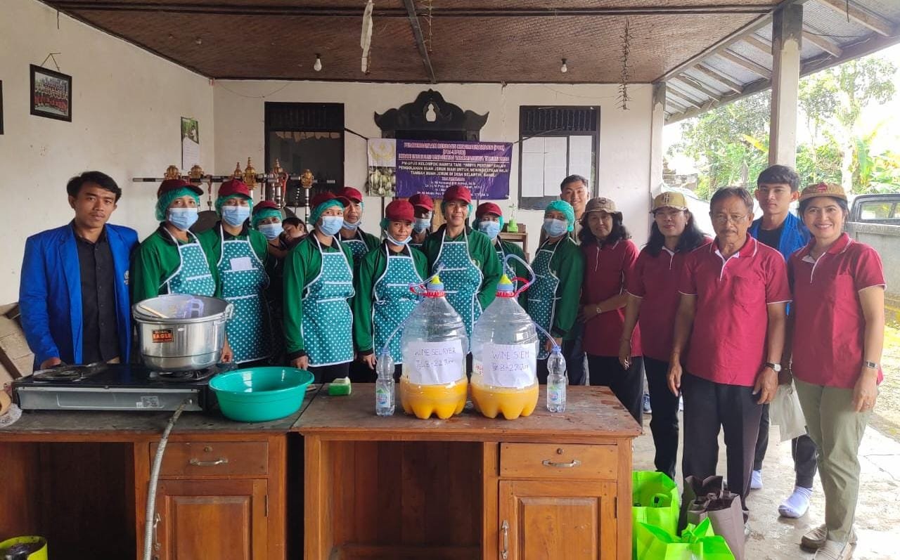 Guna membantu petani mengurangi kerugian akibat harga yang rendah, Tim akademisi Fakultas Pertanian, Universitas Warmadewa (FP-Unwar) mengajak petani, khususnya kelompok tani Wanita (KWT) untuk berinovasi dengan mengolah buah jeruk siam menjadi wine. Tim akademisi FP-Unwar tersebut terdiri dari Ir. Ni Komang Alit Astiari, M.Si., Dr. Ir. Ni Putu Anom Sulistiawati, M.Si., Ir. I Nengah Suaria, M.Si. dan Dr. Ni Made Ayu Suardani Singapurwa, STP., M.Si