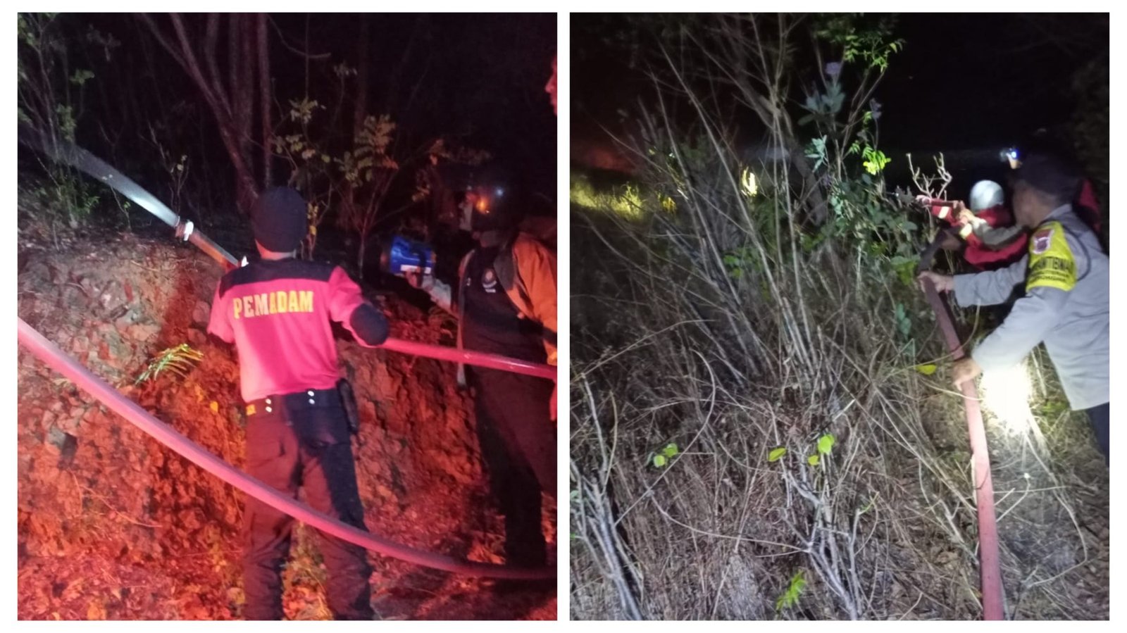 Kolase: Petugas Damkar dibantu polisi turut memadamkan kebakaran hutan kawasan Gunung Pemuteran dan area kawasan Pura Batu Kursi, Desa Pemuteran, Kecamatan Gerokgak, Buleleng, Selasa (11/7/2023). (BB/Polsek Grokgak)