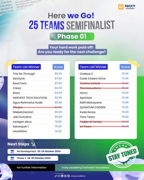 Pada tanggal 8 November 2024, lima tim terbaik yang berhasil memenuhi ekspektasi juri akan diumumkan secara resmi melalui platform National Impact Hackathon serta akun Instagram resmi @maxy.academy. Para finalis yang terpilih akan melanjutkan perjuangan ke babak final, yang dijadwalkan berlangsung dari tanggal 18 hingga 21 November 2024 di Desa Leuwimalang.