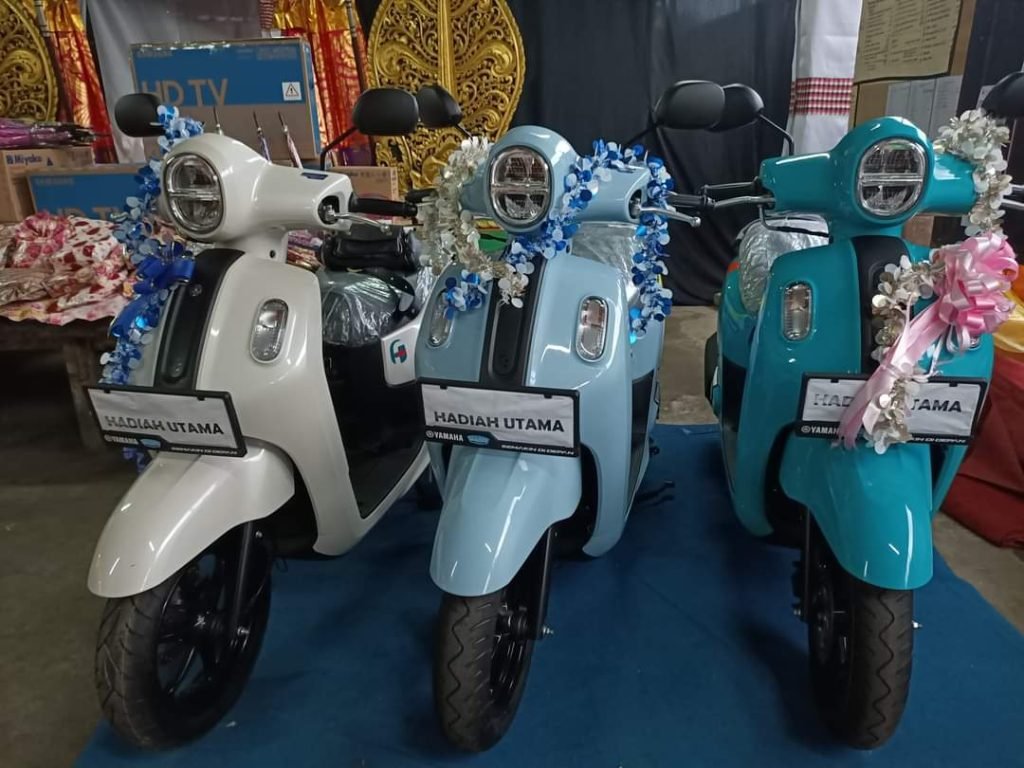 Foto: Hadiah Utama 3 Unit Sepeda Motor Yamaha Fazio (kiri) dan ratusan hadiah menarik lainnya sudah dipajang dan siap diundi di depan Pura Dalem Prajapati, Desa Adat Sarimertha, Banjarangkan, Klungkung, Rabu (6/9/2023) pukul 19.00 Wita hingga selesai. (Sumber: IGN Suprabu)