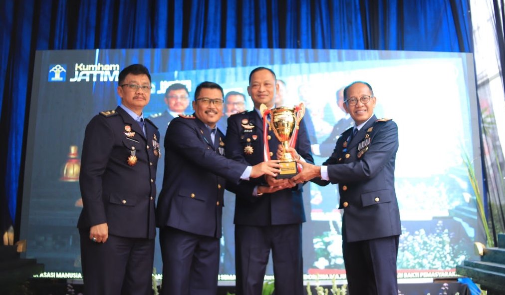 Foto: Penyerahan penghargaan kepada UPT jajaran yang berprestasi dalam kegiatan Hari Bakti Pemasyarakatan (HBP) ke-59. (BB/Hms Kemenkumham Jatim)