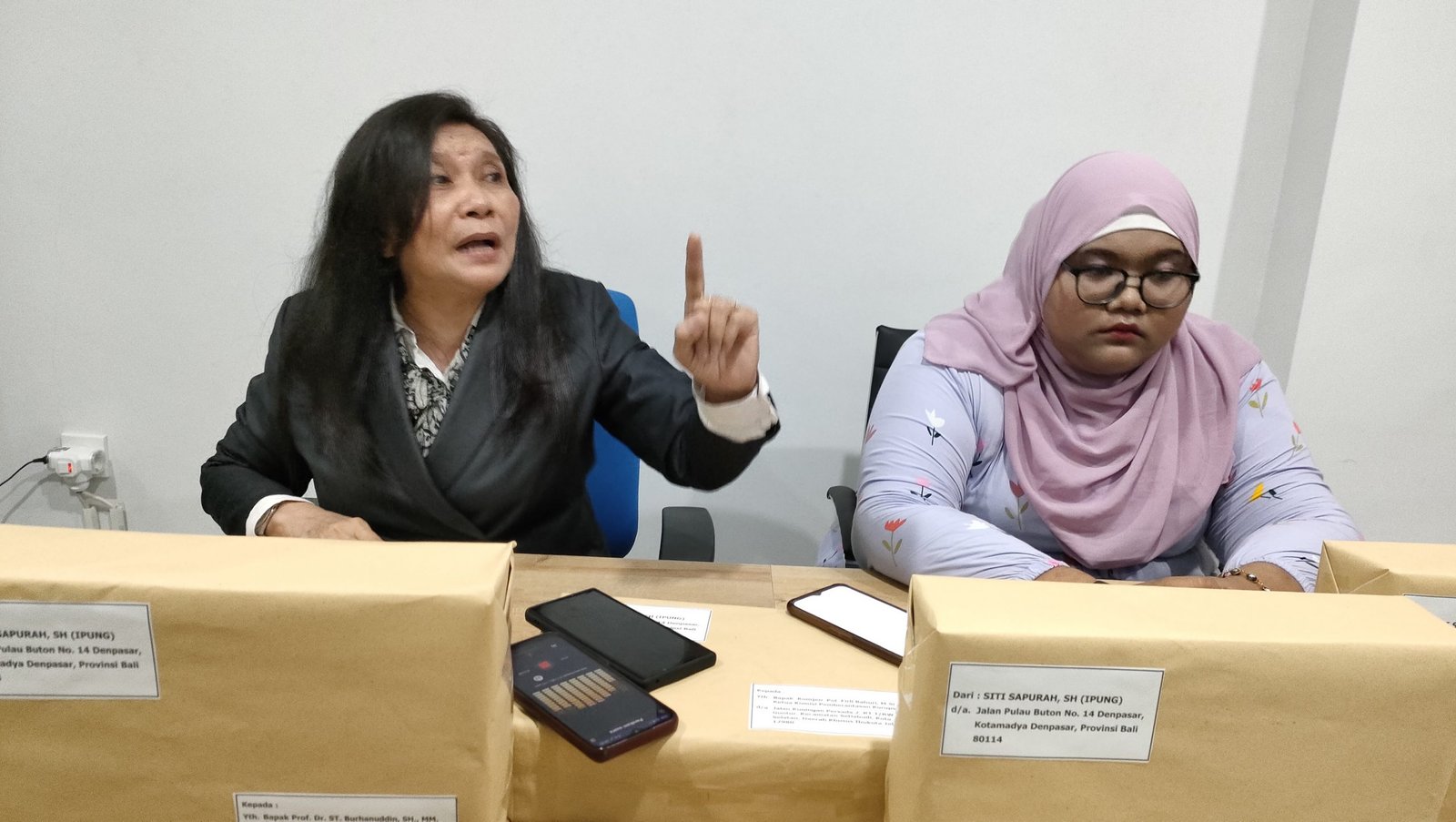 Siti Sapurah (Ipung) didampingi puterinya saat jumpa pers di kantornya, Kamis (2/6/2022) Foto: BB