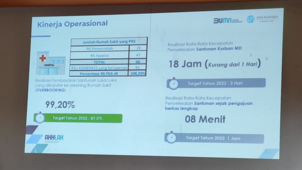 “Pembayaran korban kecelakaan di 66 rumah sakit dan juga sejumlah klinik yang ada di wilayah Bali secara overbooking. Artinya melewati target yang diberikan. Semuanya dapat terjadi karena kerja tim, bukan perorangan atau kelompok tertentu. Realisasi rata-rata kecepatan penyelesaian santunan sejak pengajuan berkas lengkap hanya 8 menit dari target tahun 2022 selama 1 jam,” urainya