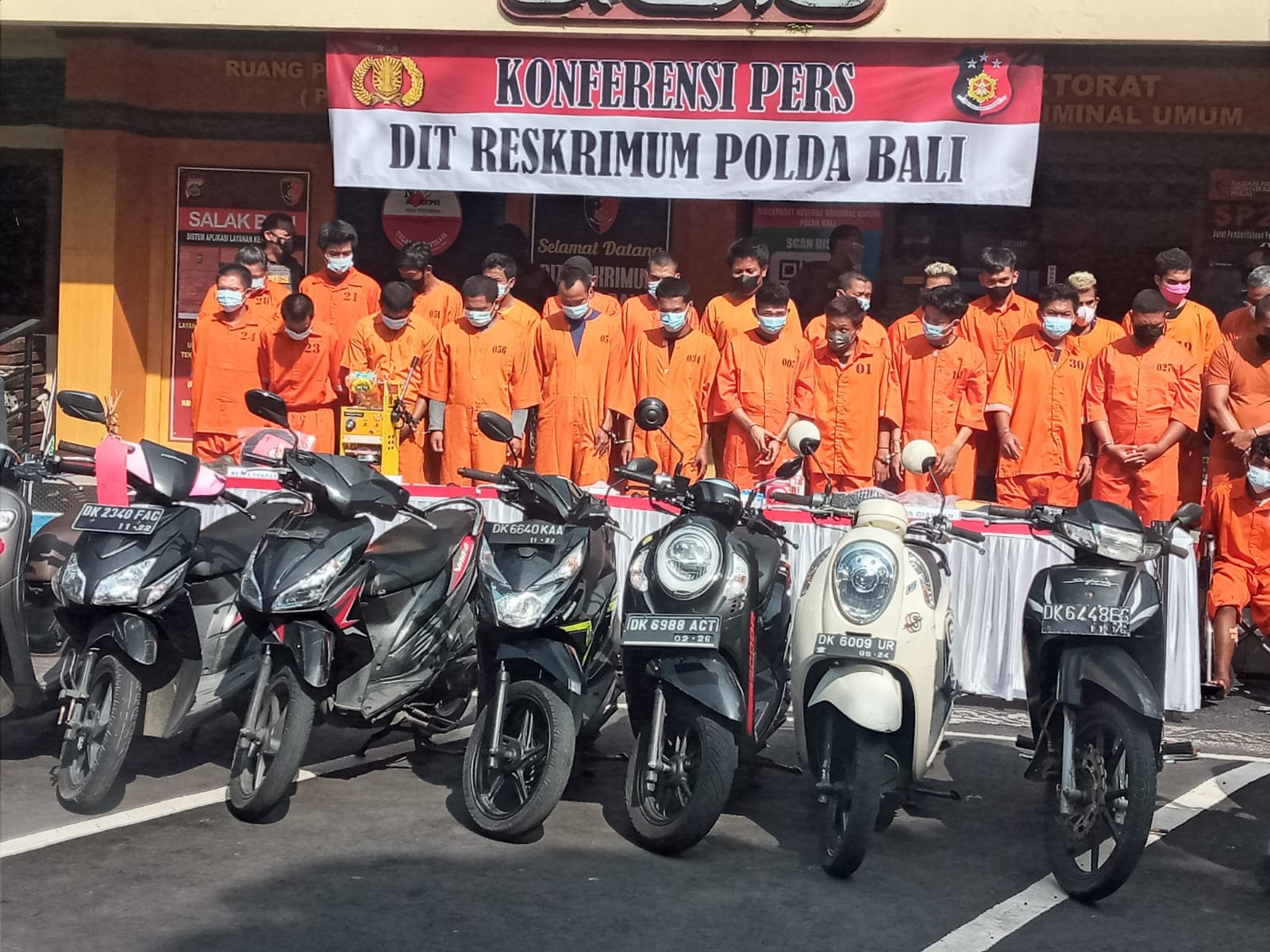 Dalam kesempatan itu, puluhan tersangka dan dan barang bukti dihadirkan di hadapan awak media. Dari plat polisi hitam hingga tampak satu barang bukti sepeda motor jenis matic berplat merah. Pelaku mengaku mencuri motor tersebut untuk kembali ke kampung halamannya di Lombok, NTB.