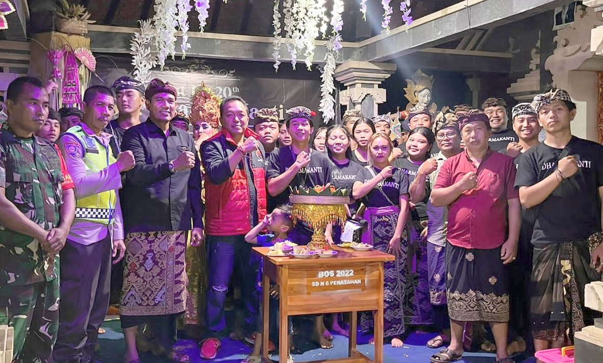 Foto: Calon anggota DPD RI, I Ketut Wisna atau JMW (tiga dari kiri) menghadiri dan mendukung acara perayaan HUT ke-20 STT Dharma Kanti di balai Banjar Bun, Desa Sangketan, Kecamatan Penebel, Kabupaten Tabanan, Minggu (31/12/2023) malam. (Sumber: BB/Dwi Pradana/Gus Arya)