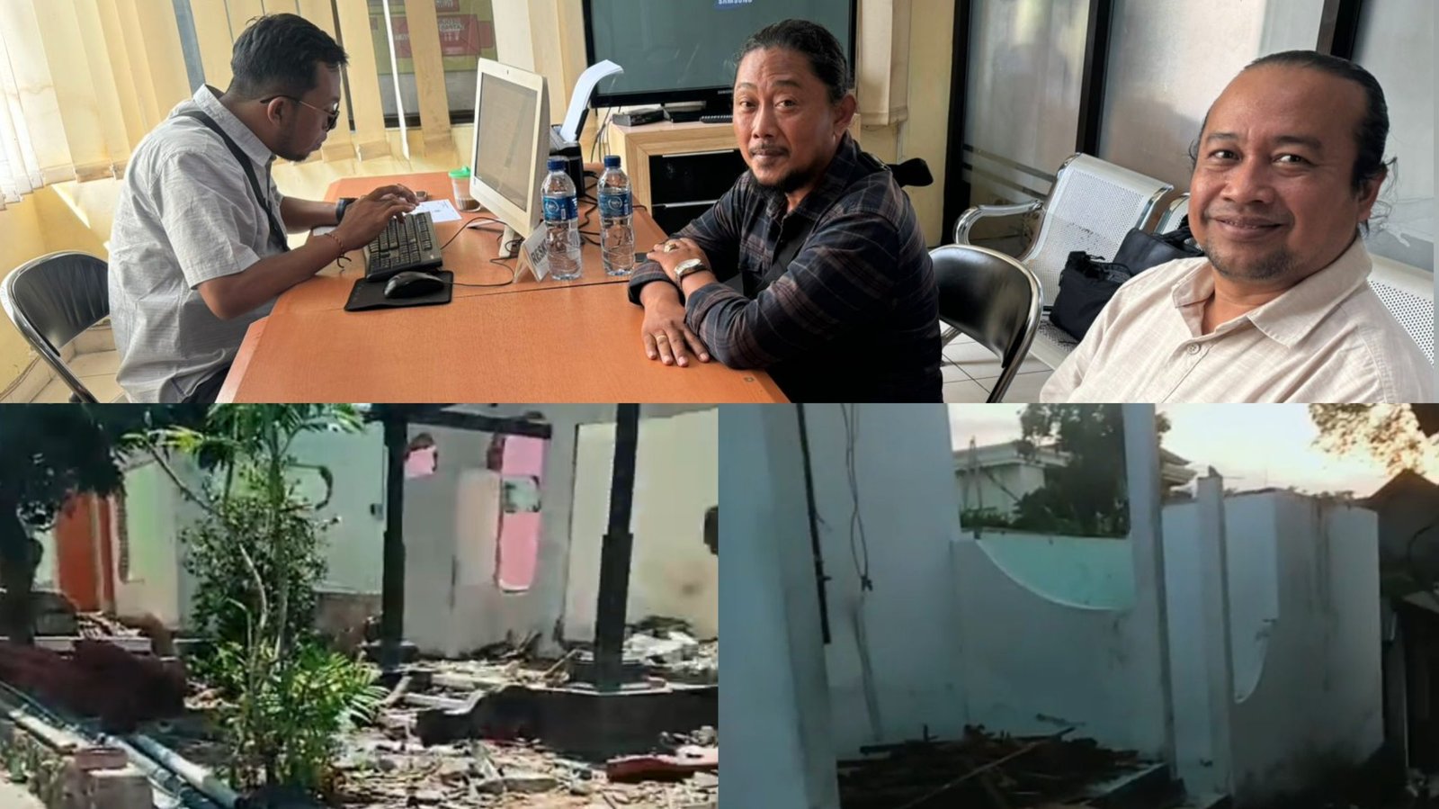 Kolase foto: Advokat Jro Komang Sutrisna, SH (kemeja putih) selaku kuasa hukum pelapor, I Gusti Putu Oka Pratama Weda, menegaskan penetapan tersangka GS dan KN, langkah awal membongkar jaringan mafia tanah. Foto bangunan ahli waris Jeroan Belong, Denpasar yang dieksekusi dan dihancurkan pada tahun 2019. (barometerbali/rah)
