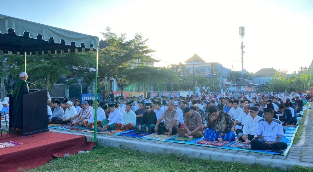 Barometer Bali | Denpasar – Perayaan Hari Raya Iduladha 1446 Hijriah yang jatuh pada 10 Dzulhijjah turut dilaksanakan oleh warga Dusun Tegal Kori Kaja, melalui pelaksanaan Sholat Idul Adha, di fasilitas umum setempat, Jumat (6/6/2025).
