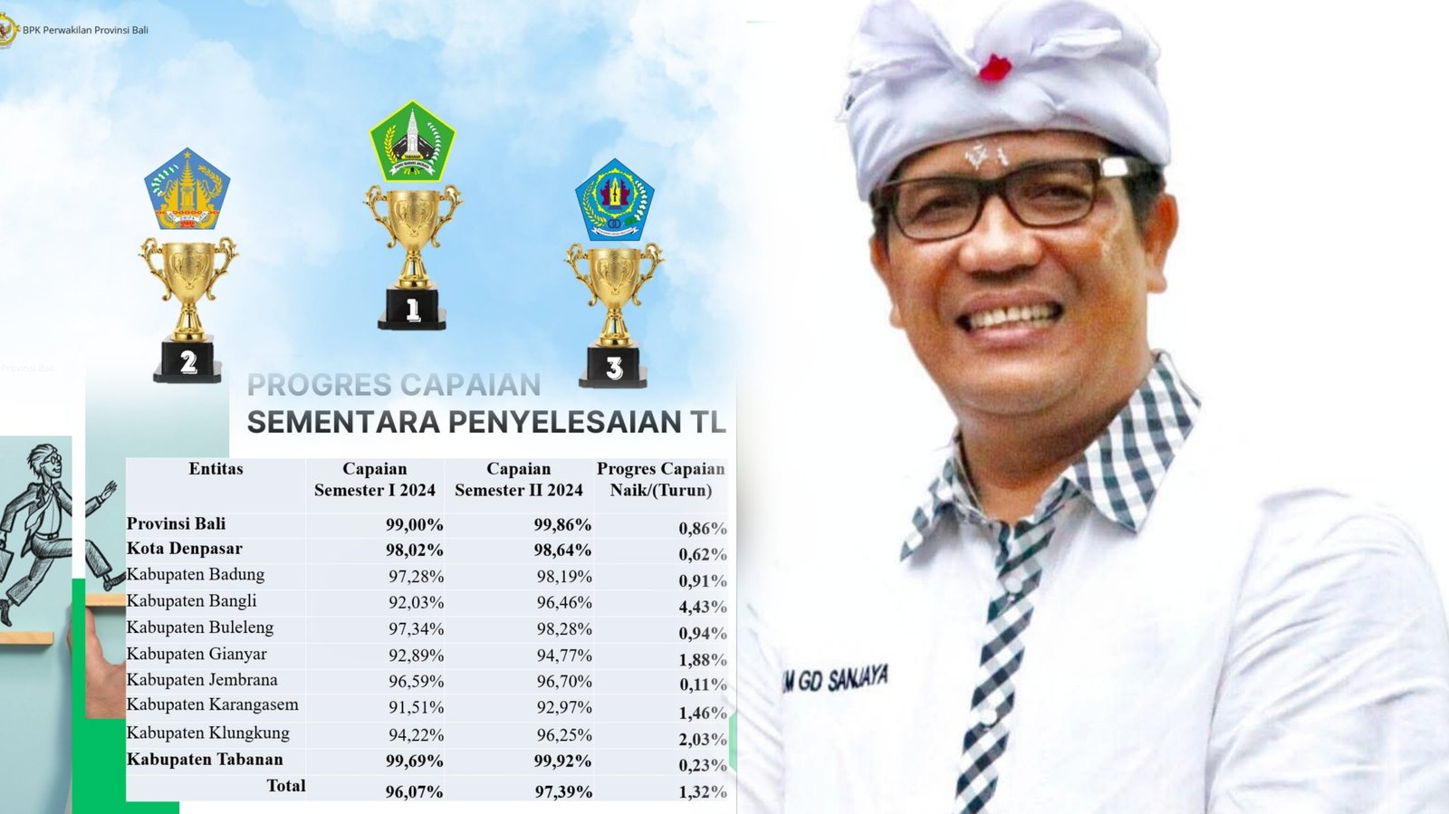 Capaian penyelesaian tindak lanjut BPK RI semester II Tahun 2024 mencapai progres sebesar 99,92%. Capaian ini menjadikan Tabanan meraih posisi pertama disusul oleh Provinsi Bali di posisi II dan Kota Denpasar posisi III. Kabupaten Tabanan berhasil menjadi yang terbaik dalam penyelesaian tindak lanjut BPK RI selama tiga tahun berturut-turut.