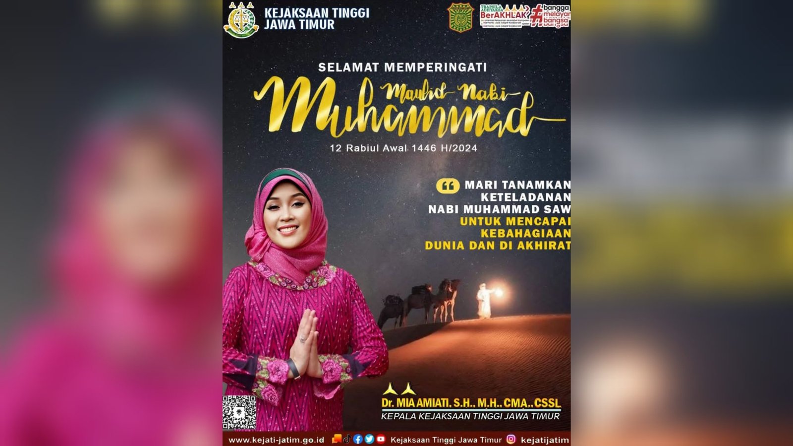 Ket foto: Kepala Kejaksaan Jawa Timur (Kajati Jatim), Dr. Mia Amiati, S.H., M.H., CMA., CSSL mengucapkan selamat Hari Maulud Nabi Muhammad 12 Rabiul Awal 1446 H/2024. (Sumber: barometerbali/redho)