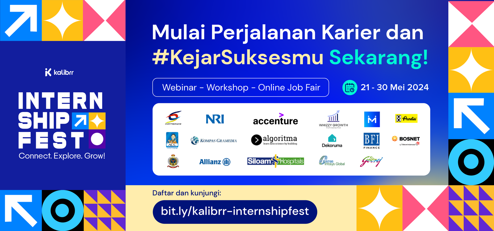 Kalibrr akan gelar acara job fair secara daring pada 21 – 30 Mei 2024, bertajuk Internship Festival. Puluhan lowongan magang dari 15 mitra perusahaan Kalibrr akan tersedia untuk mahasiswa atau fresh graduate di berbagai kota di Indonesia.