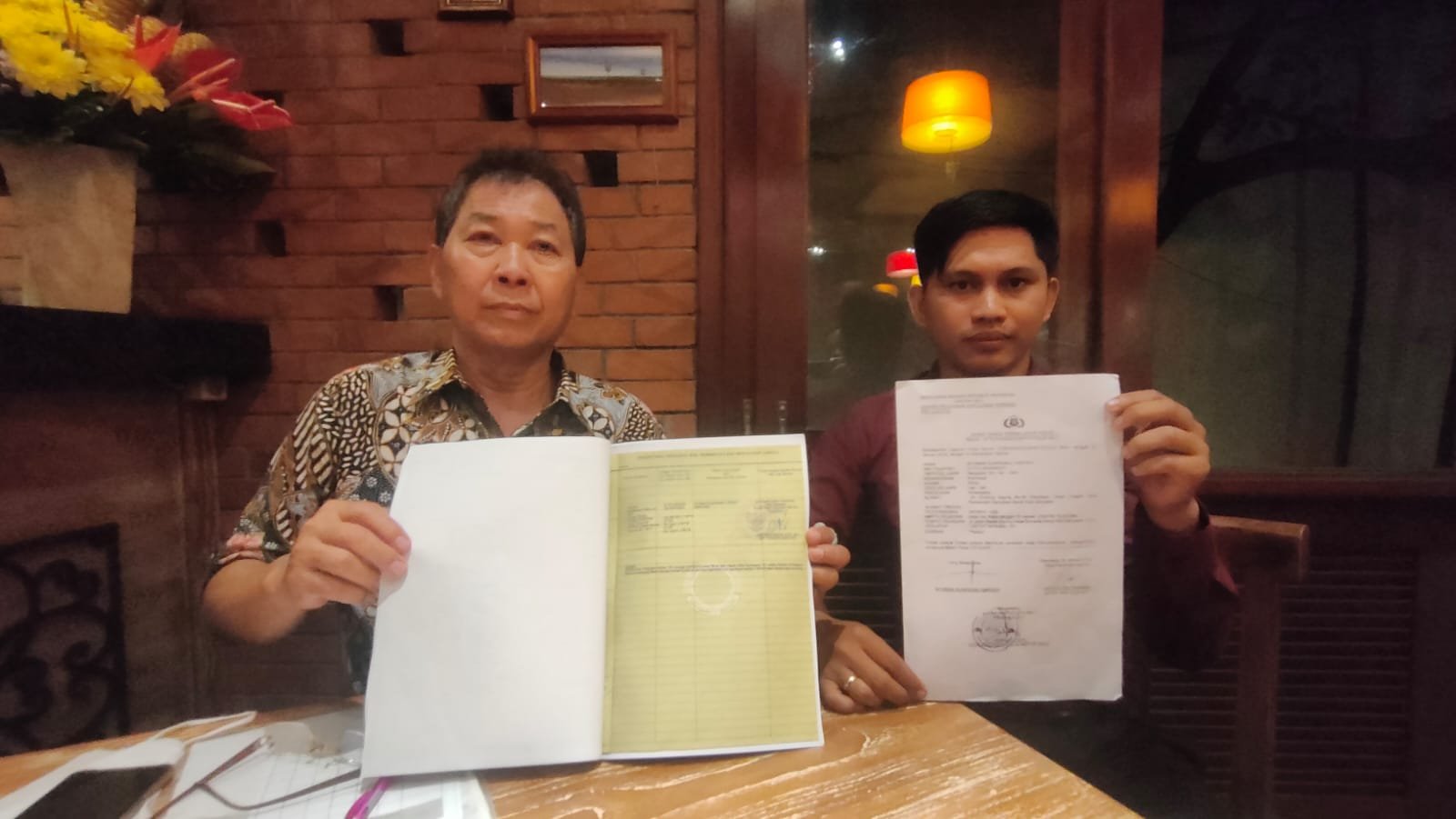 Foto: Nyoman Suarsana Hardika (kiri) didampingi kuasa hukumnya Made Dwiatmiko saat menunjukan SHM bukti kepemilikannya atas objek tanah di Jalan Badak Agung, Denpasar, Jumat (12/1/2024). (BB/213)