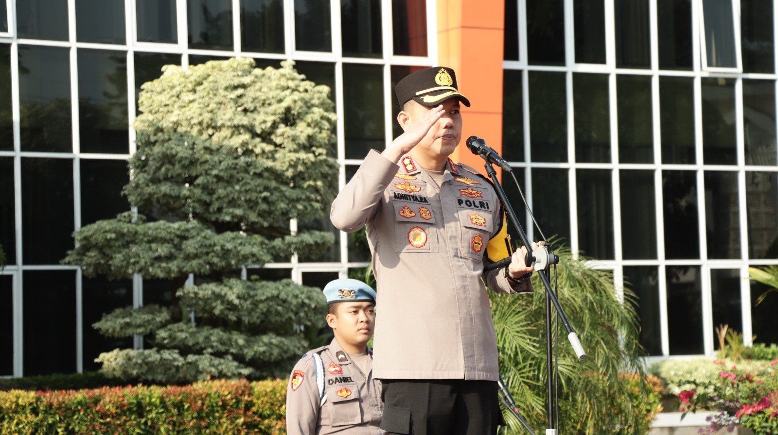 Foto: Kapolres Gresik AKBP Adhitya Panji Anom memerintahkan intensifikasi patroli dan razia dalam apel pagi yang dilaksanakan di halaman Mapolres Gresik pada hari Senin (27-05-2024). (Sumber: BB/Redho).