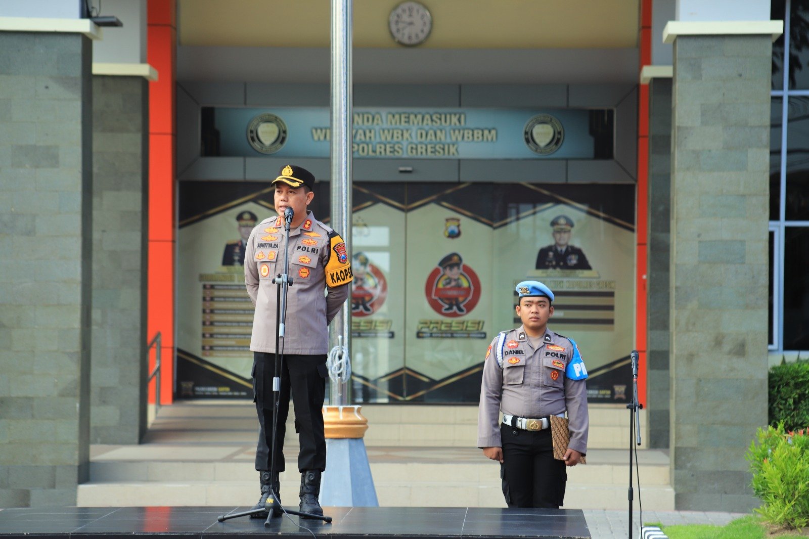 Foto: Apel pagi menyampaikan beberapa poin penting terkait dengan potensi bahaya yang dihadapi masyarakat. Kapolres menyampaikan saat memimpin apel di halaman Mapolres Gresik, Senin (6/5/2024). (Sumber: BB/Redho).