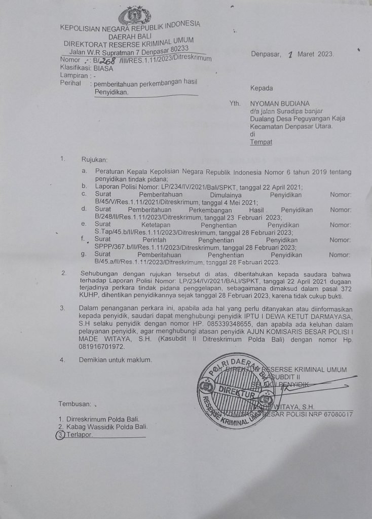 Surat pemberitahuan perkembangan hadil penyidikan dari Ditreskrimum Polda Bali tanggal 1 Maret 2023. (Sumber: Dok pribadi)