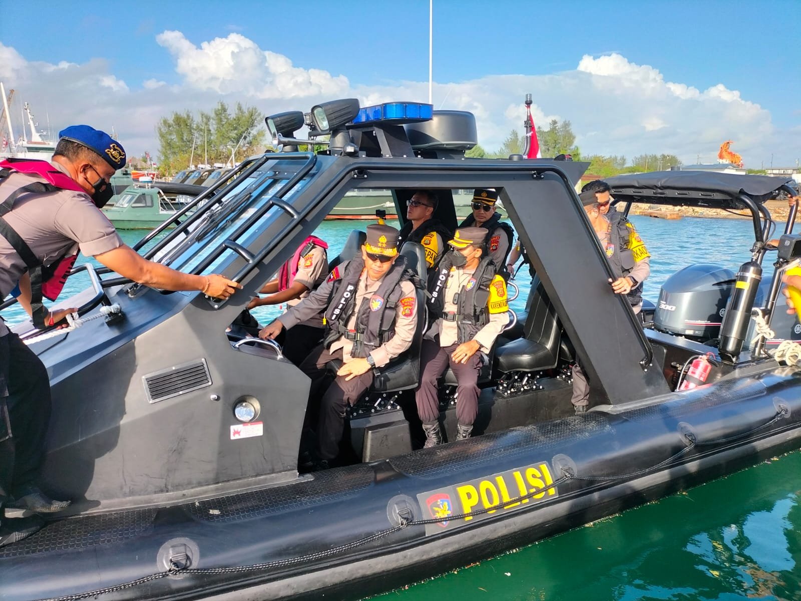 UJI COBA – Kapolda Bali lakukan sea trail (uji coba) dua kapal RIB dari dermaga pasiran Pelabuhan Benoa, Jumat (12/8/2022) pukul 08.00 Wita.