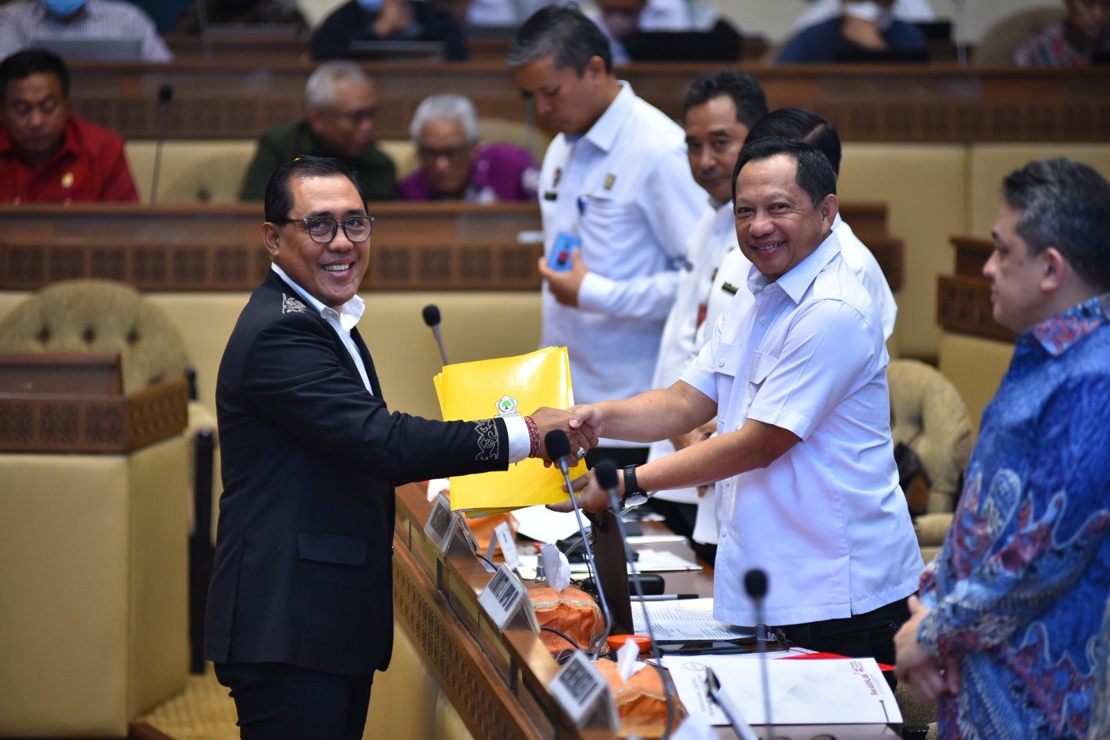 Anggota Komisi II DPR RI Dapil Bali Anak Agung Bagus Adhi Mahendra Putra (kiri) yang akrab disapa Gus Adhi menyerahkan dokumen kepada Menteri Dalam Negeri Tito Karnavian (kanan) dalam Rapat Kerja Tingkat I Komisi II DPR RI dengan pemerintah pada Rabu (29/3/2023) di kompleks parlemen gedung DPR RI Senayan Jakarta. (Foto: BB/Amt)