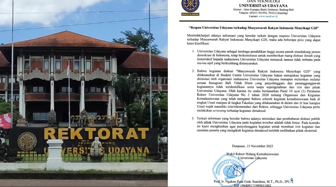 - Bahwa kegiatan diskusi “Musyawarah Rakyat Indonesia Menyikapi G20” yang dilaksanakan di Student Centre Universitas Udayana bukan merupakan kegiatan yang diinisiasi oleh organisasi mahasiswa Universitas Udayana manapun melainkan melalui seruan “Instagram Bali Tidak Diam”, yang penyelenggara dan penanggung jawab kegiatannya tidak terindentifikasi serta tanpa sepengetahuan dan izin dari pihak Universitas Udayana.