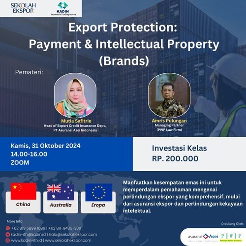 Sebagai bentuk dukungan terhadap keberhasilan program pelatihan ekspor ini, PT Asuransi ASEI Indonesia dan PWP Laws akan menjadi narasumber utama pada sesi kelas yang akan diselenggarakan pada hari Kamis, 31 Agustus 2024. Dengan tema “Perlindungan Ekspor”, sesi kelas ini akan menghadirkan Ibu Mutia Safitrie, Kepala Departemen Asuransi Kredit Ekspor PT Asuransi ASEI Indonesia, yang akan berbagi pengetahuan mendalam mengenai perlindungan risiko ekspor. Selain itu, Bapak Amris Pulungan, Managing Partner PWP Laws, akan memberikan pemahaman yang komprehensif mengenai aspek hukum dalam kegiatan ekspor, terutama terkait dengan perlindungan kekayaan intelektual.