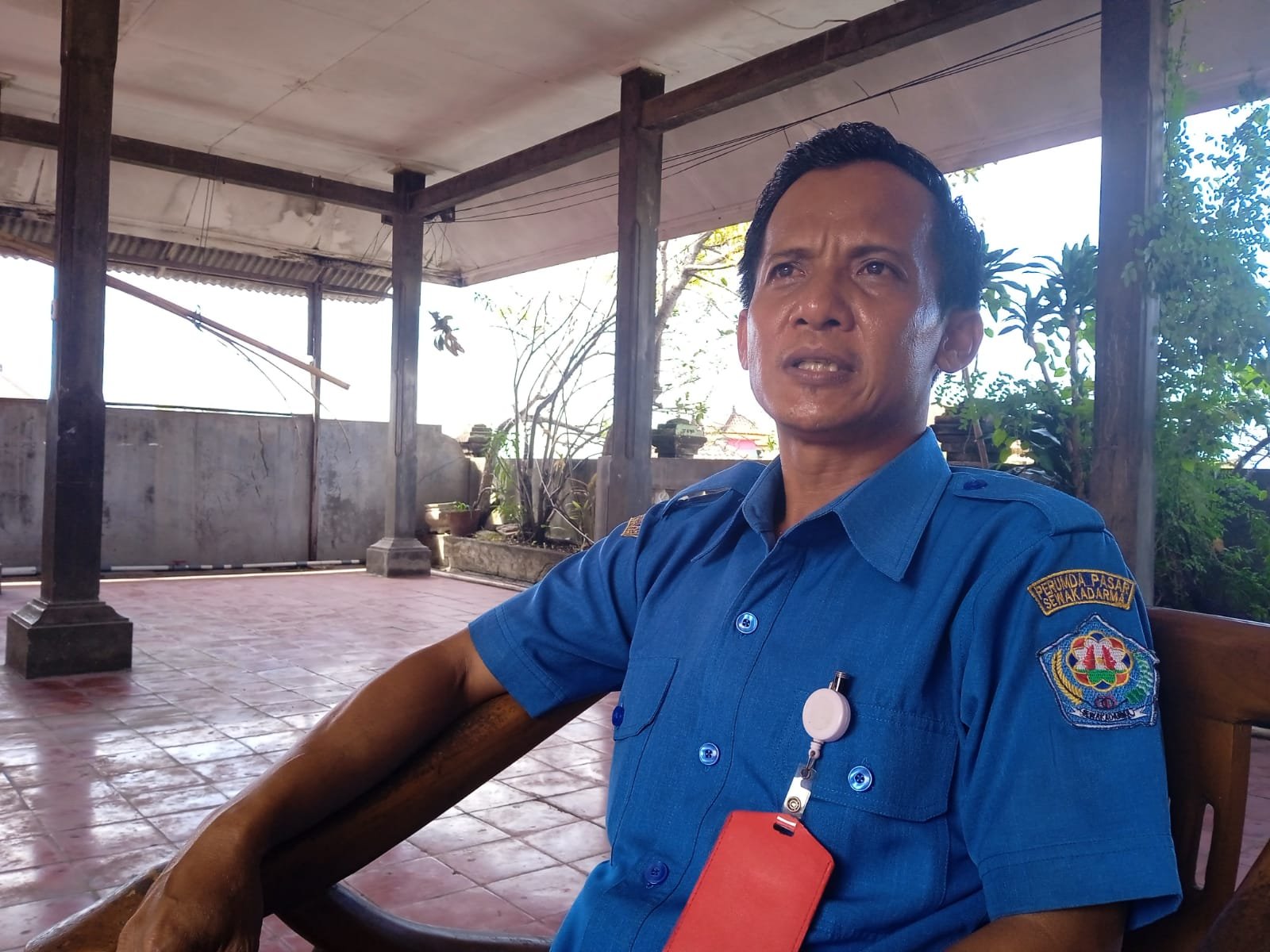 Ket foto: Pengelola Pasar Sanglah, Denpasar, Wayan Kardika saat diwawancarai barometerbali.com, di kantornya, Senin, (10/6/2024). (Sumber: BB/Rian)