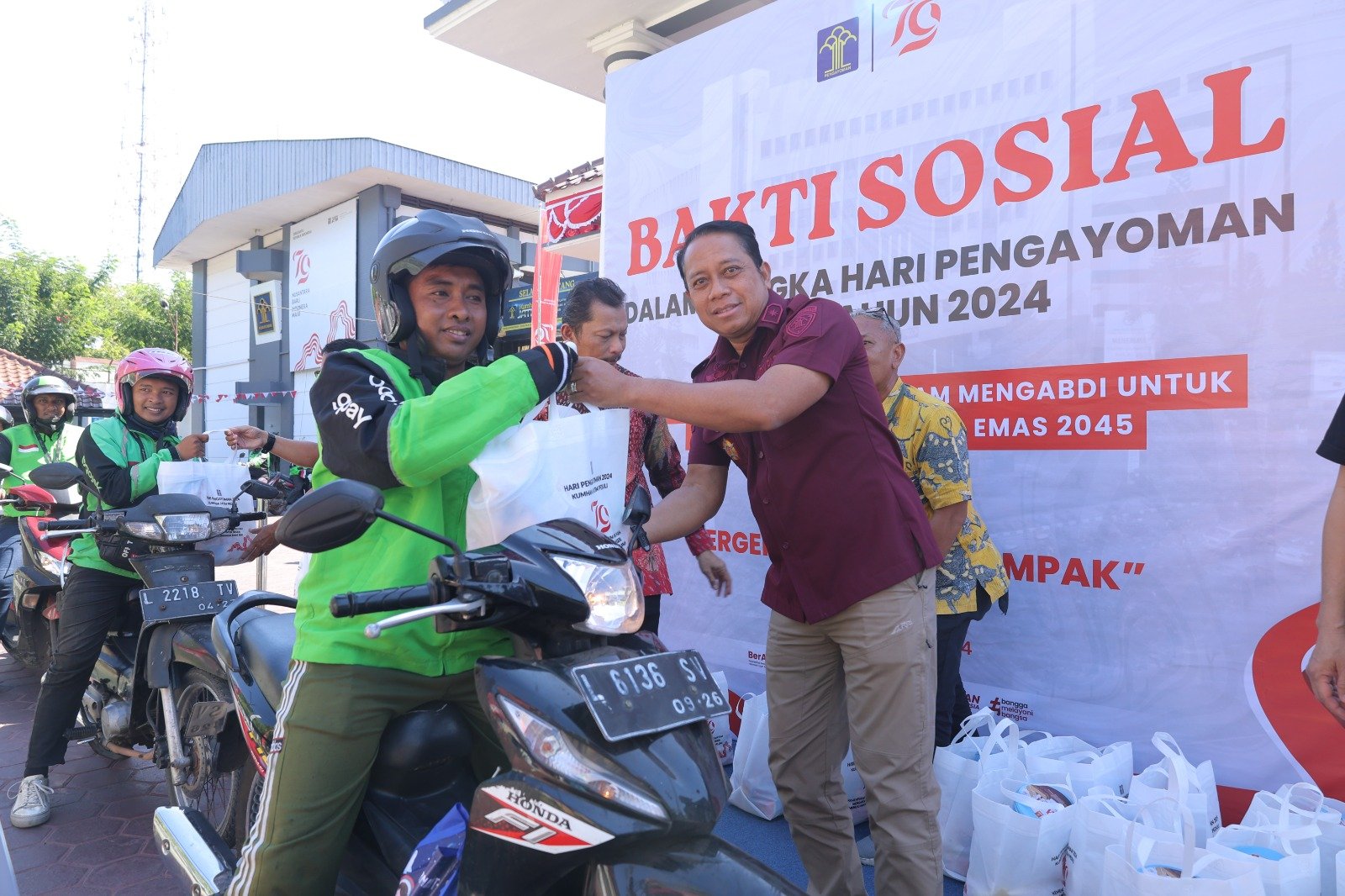 Siang harinya, Kakanwil Heni Yuwono memimpin jajarannya menggelar bakti sosial dengan membagi sembako untuk mitra pengemudi ojok online, Kamis (8/8).