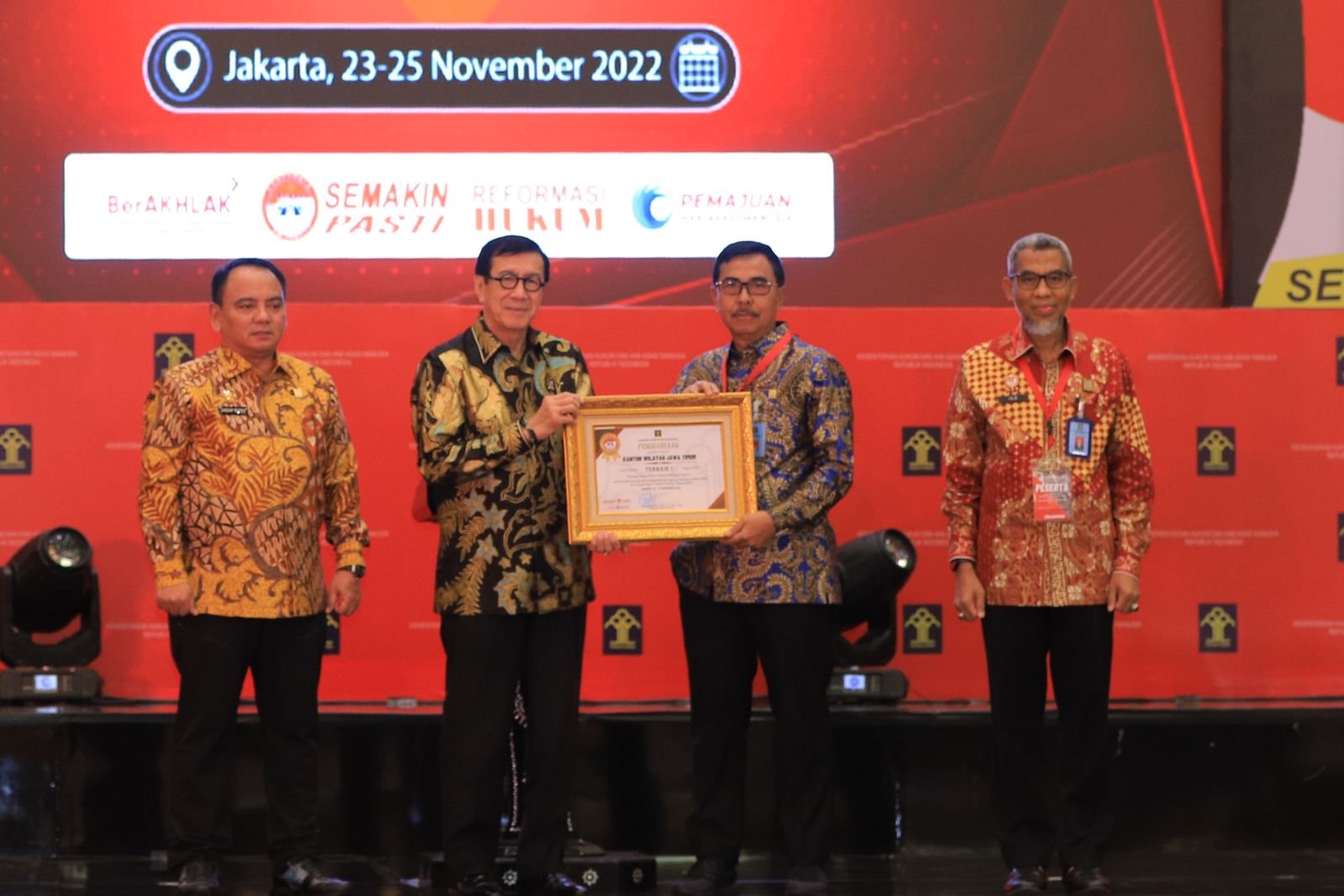 Foto: Menkumham Yasonna H Laoly menyerahkan penghargaan kepada Kemenkumham Jawa Timur sebagai Kanwil Berkinerja Baik, diterima Kakanwil Kemenkumham Jatim Zaeroji di Hotel Grand Mercure Kemayoran, Jakarta, Kamis (24/11/2022). (kumham/jatim)