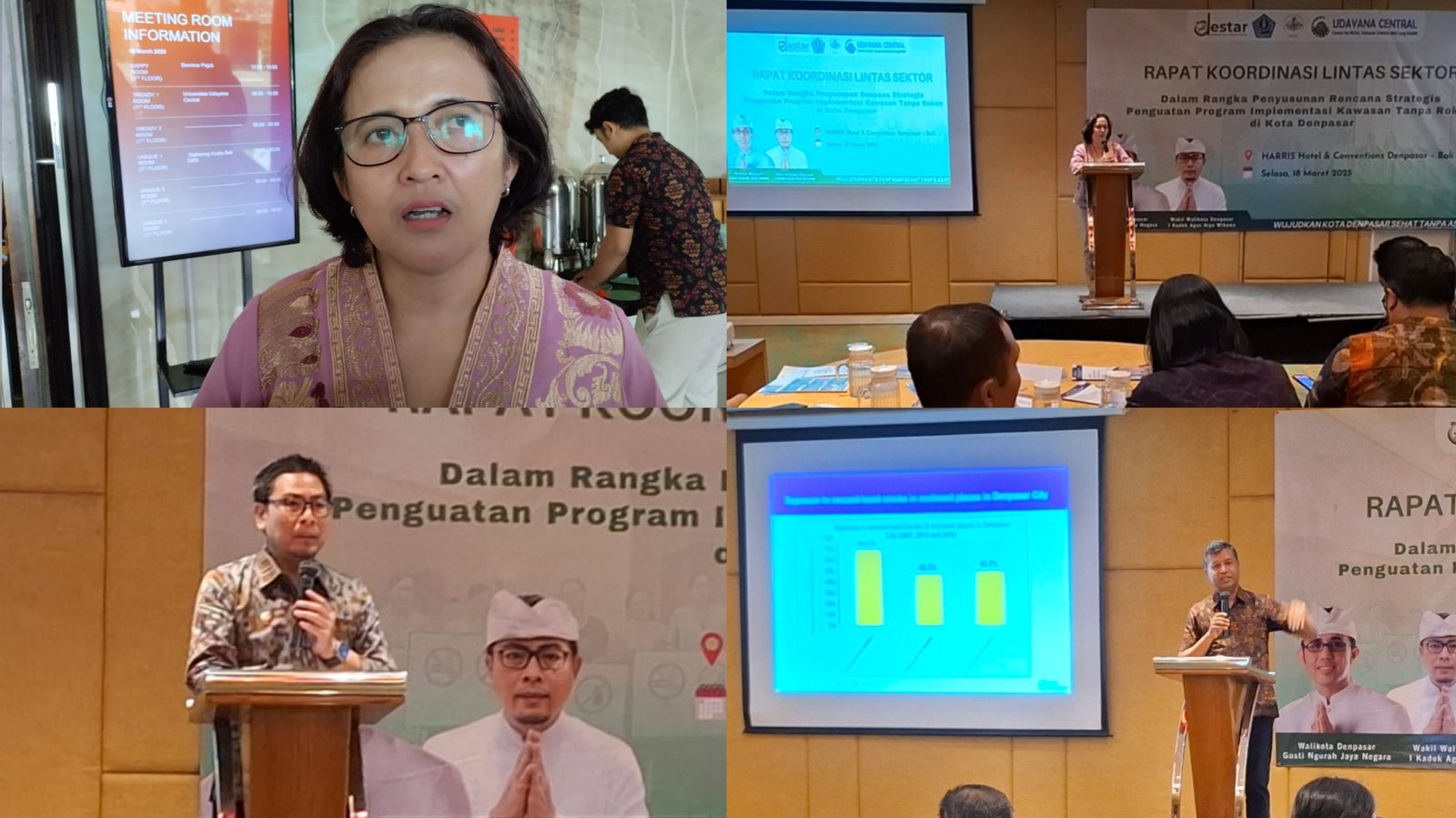 Kolase foto: Dalam Rapat Koordinasi Lintas Sektor, Ketua Udayana Central, dr. Putu Ayu Swandewi Astuti, Sked, MPH, Ph.D, menegaskan pentingnya evaluasi menyeluruh terhadap Perda Kawasan Tanpa Rokok (KTR) yang digelar di Denpasar, Selasa (18/3/2025). (barometerbali/rah)