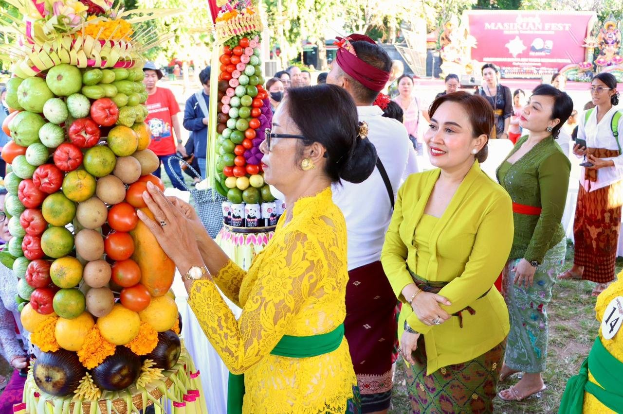 Lomba Gebogan dihadiri Ketua GOW Kota Denpasar, Ny. Ayu Kristi Arya Wibawa yang juga sekaligus meninjau pelaksanaan perlombaan. Penyelenggaraan lomba Gebogan pada hari kedua “Masikian” Festival diikuti 16 peserta dari anggota PKK Kota Denpasar di empat kecamatan.