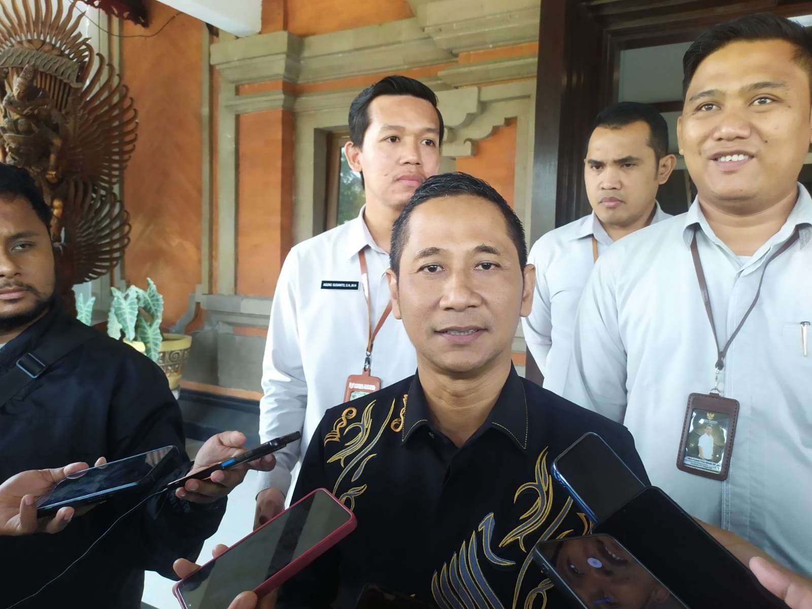 Foto : Komisi Yudisial RI, Mukti Fajar Nur Dewata beserta Jajarannya saat memberikan keterangan pers di Lobby depan Kejati Bali, Kamis (7/11/2024). (Sumber: BB/Rian)