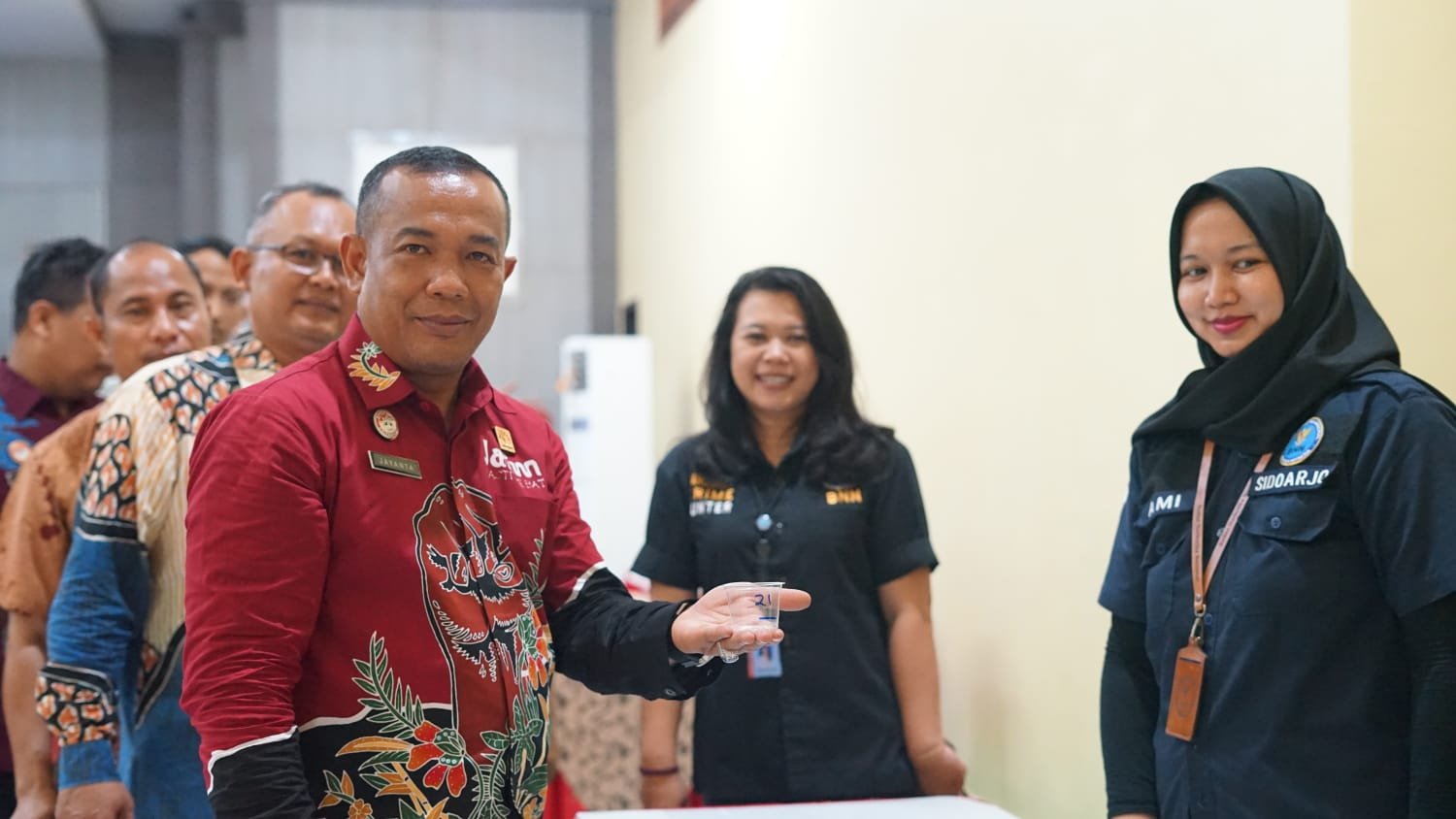 Foto: Kalapas Surabaya Jayanta saat kegiatan tes urine di Lapas Surabaya, Selasa (7/5/2024). (Sumber: BB/Redho)