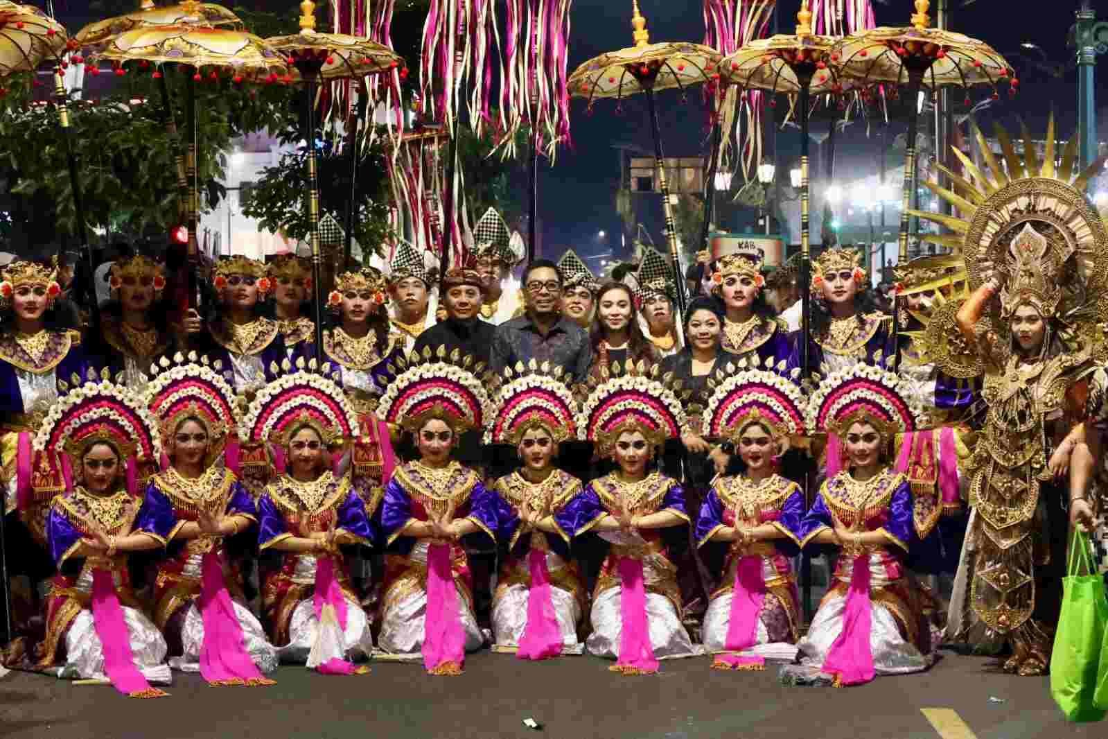 Foto: Kontingen Budaya Kota Denpasar berfoto bersama dengan Wakil Walikota Denpasar, I Kadek Agus Arya Wibawa dan Ketua GOW Kota Denpasar, Ny. Ayu Kristi Arya Wibawa, usai menyuguhkan penampilan Tarian Janger pada gelaran Karnaval Budaya Nusantara, serangkaian Rapat Kerja Nasional (Rakernas) ke-XI Jaringan Kota Pusaka Indonesia (JKPI) Tahun 2025, yang digelar di sepanjang kawasan Jalan Malioboro, Rabu (6/8) malam. (barometerbali/win/rah)