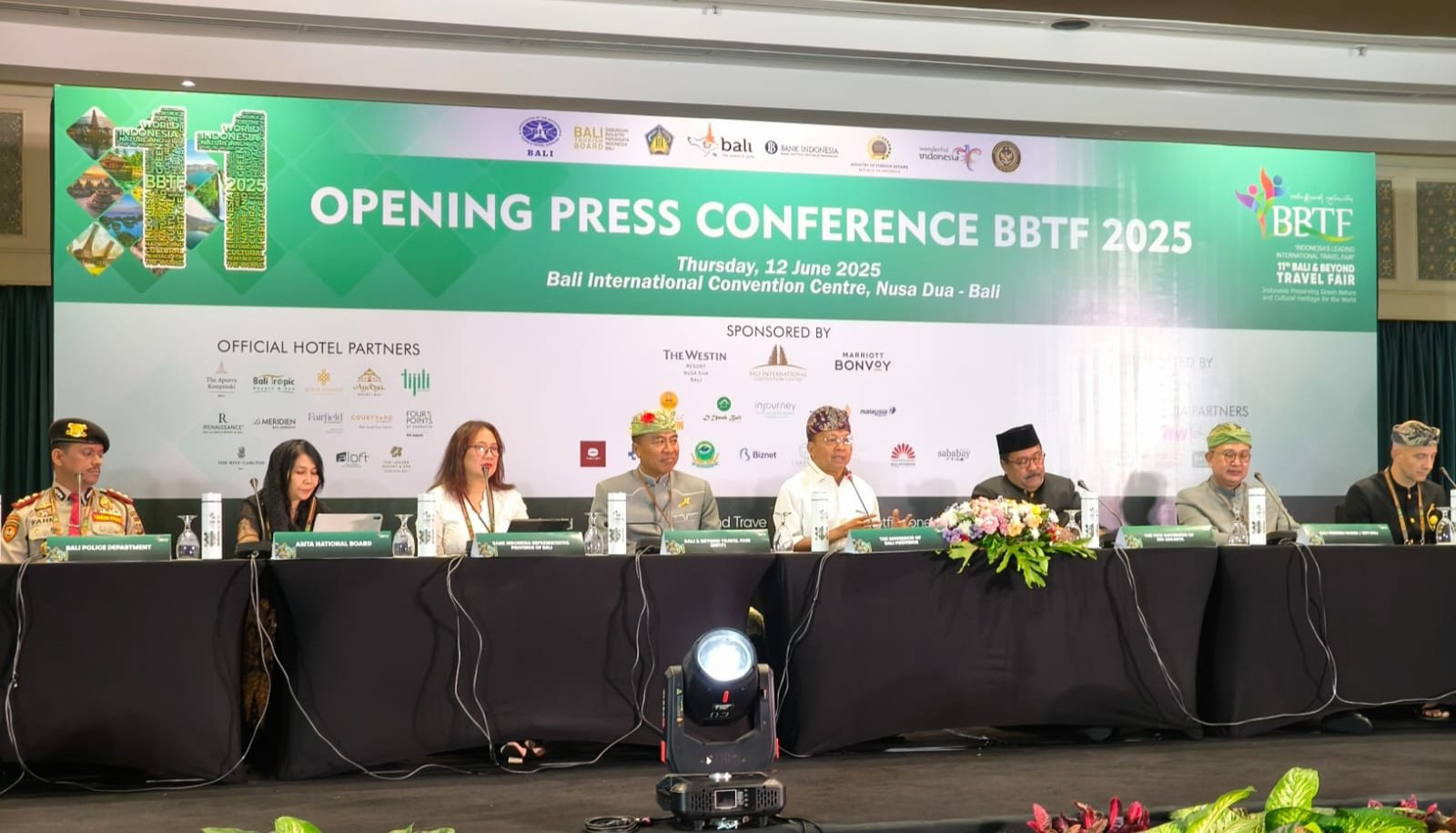 Gubernur Bali Wayan Koster menepis isu PHK massal di Kabupaten Badung, dalam konferensi pers Bali and Beyond Travel Fair (BBTF) ke-11 di Hotel Westin, Nusa Dua, Rabu (12/6/2025). (barometerbali/red)