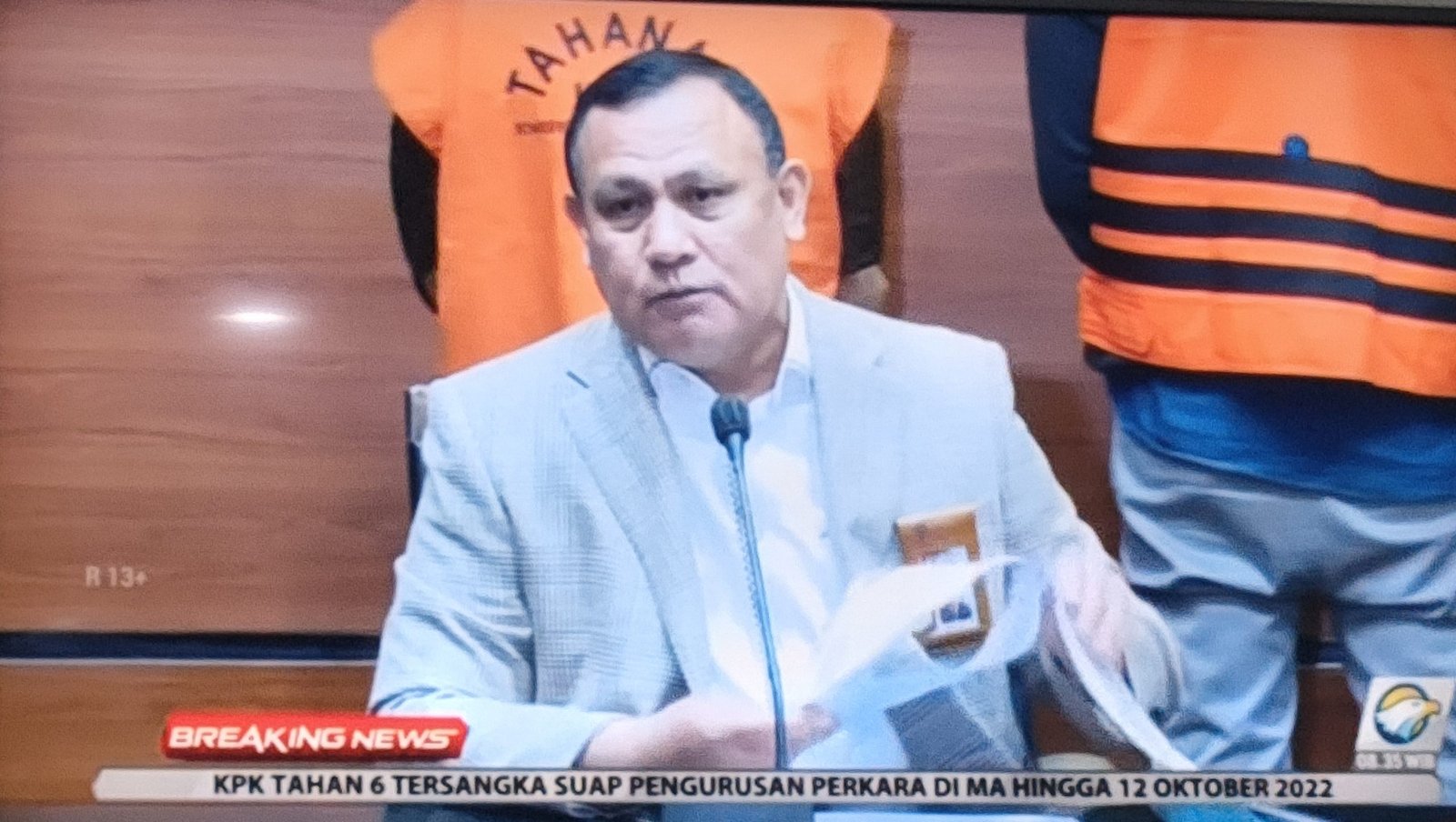 Ket foto: Ketua KPK Firli Bahuri menggelar konferensi pers penetapan tersangka terkait perkara dugaan suap pengurusan perkara di Mahkamah Agung di Gedung KPK, Jakarta Selatan, Jumat (23/9/2022). (tangkapan layar/metro tv)