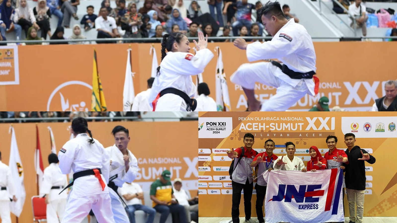 Kolase foto: Penampilan Ksatria JNE Bogor Haggies Mugara yang sukes meraih Medali Emas dan Perak dalam cabang olahraga Shorinji Kempo pada PON XXI di Aceh-Sumut. (barometerbali/jne)
